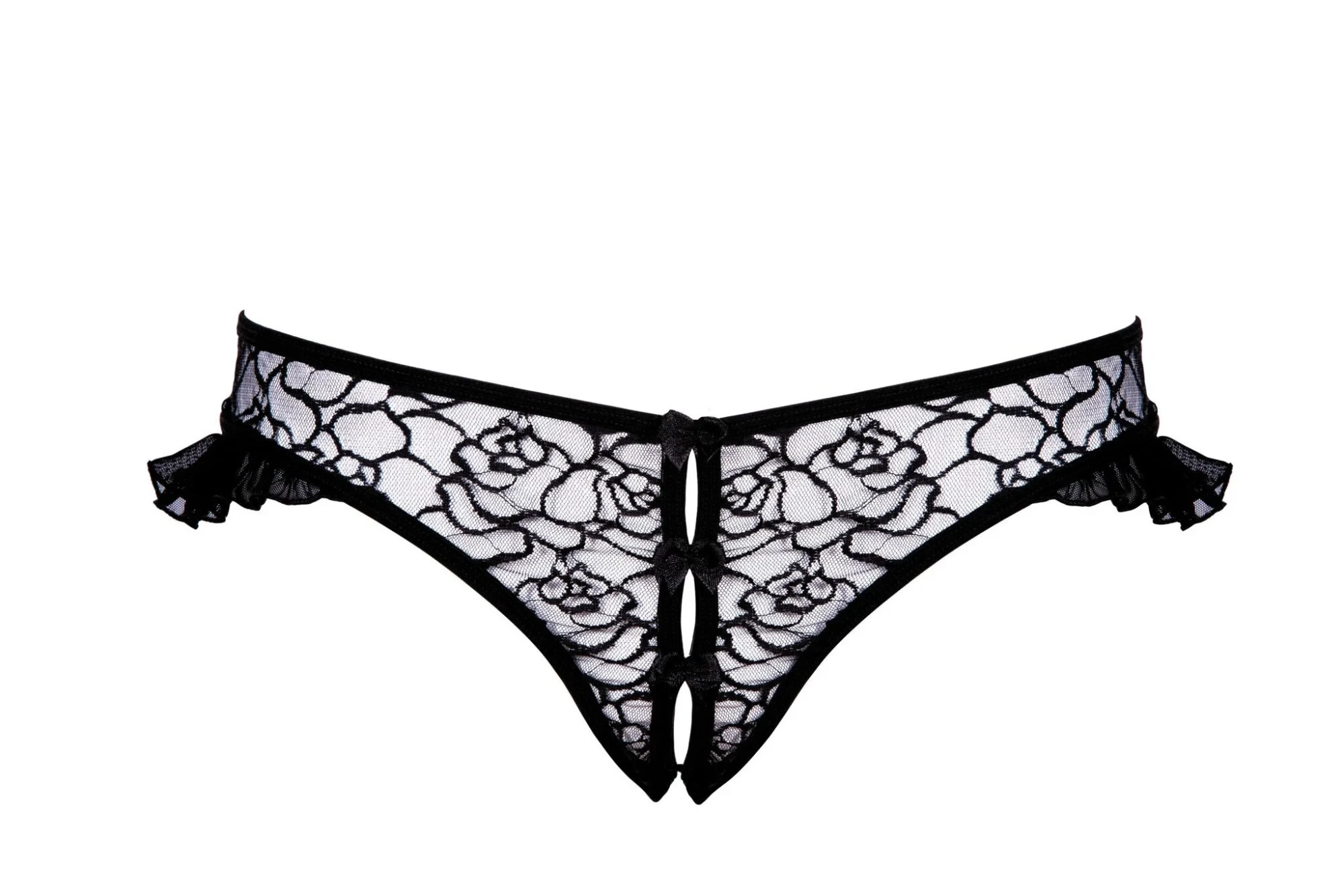 Jemné, černé kalhotky zdobené drobnými mašličkami. Vpředu i vzadu se plazí, rozhodně koketují s pohledem. Na bocích jsou koketní volánky. Celá krajka, jemná, krásně leží na bocích.