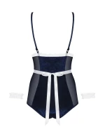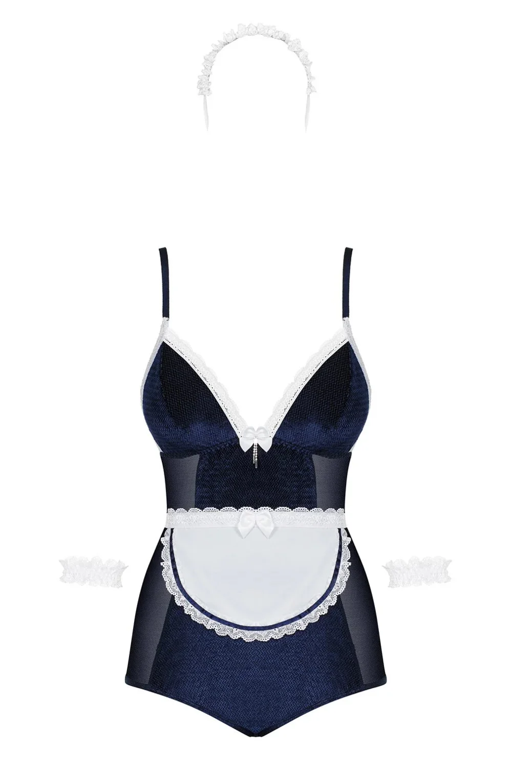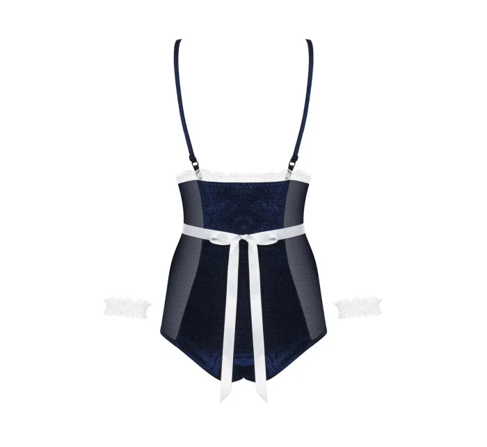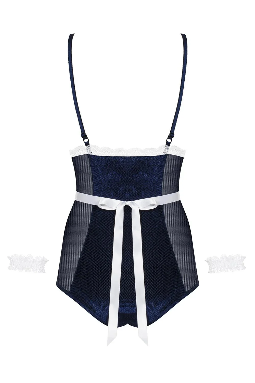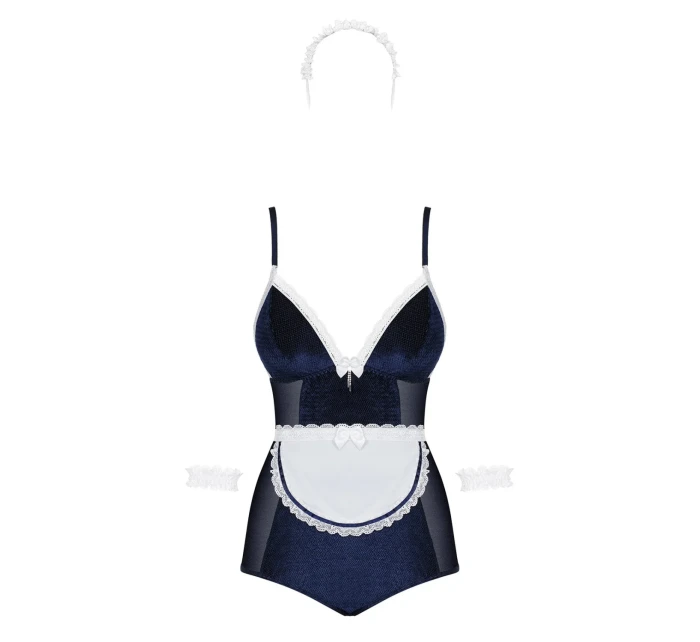 Dámský erotický kostým Maid teddy OBSESSIVE - světle modrá barva - sametový, tmavě modrý materiál - bílá zástěrka se šněrováním - vyztužené košíčky podprsenky - poprsí vypadá fantasticky - průsvitná síťovina na pravé a levé straně - nastavitelné pásky - lemované bílou krajkou - saténová mašlička a lesklý přívěsek - nádherné detaily - krajková čelenka a náramky - kostým se skládá z: teddy, zástěry, čelenky, náramků - tkaniny jsou velmi měkké a elastické