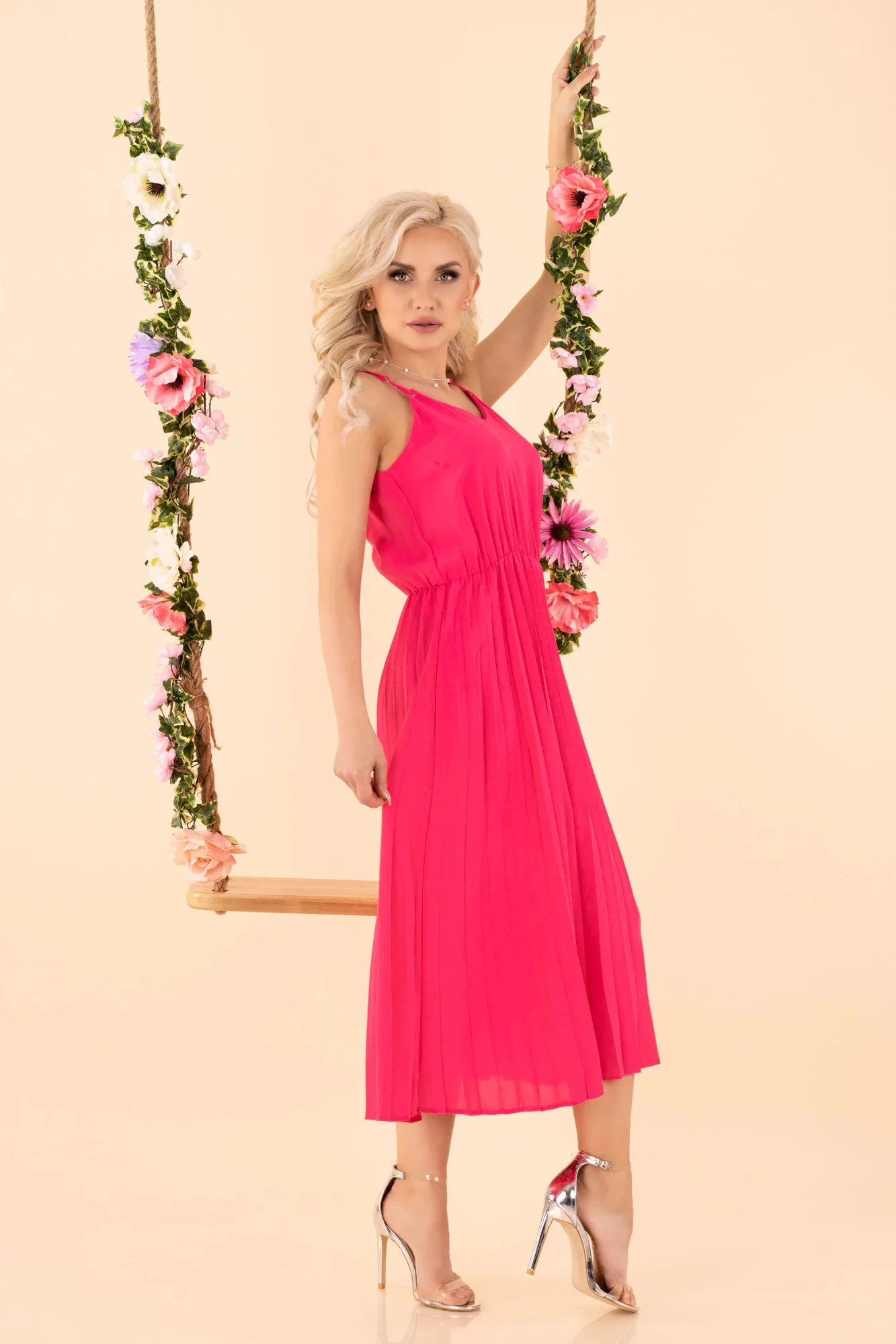 Krásné, pastelové, vzdušné šaty, délka midi, délka do půli lýtek, ve spodní části zakončené lehkým, módním řasením. Střih je uprostřed v pase projmutý, což umožňuje žensky zvýraznit horní část těla. Spodní část je vzdušná a volná, výstřih do V, ramínka v podobě tenkých šňůrek, složení: 95 % polyester, 5 % spandex. Model měří 170 cm.