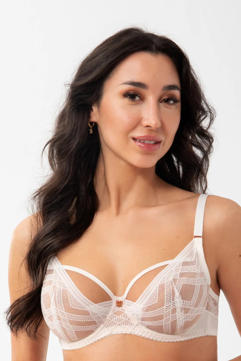 Biustonosz miękki przeznaczony dla kobiet ze średnim i dużym. Zapewnia efekt uniesienia i zebrania biustu do środka, 3-częściowe miski z tiulu stabilnego, pokryte dodatkową warstwą koronki elastycznej. Górna krawędź wykończona gładką taśmą. Dla zwiększenia komfortu użytkowania górna krawędź pasa obwodu wykończona miękkimi lamówkami. Ukryte fiszbiny boczne zapobiegające zwijaniu się materiału. Tył z kryjącej lycry połączonej z koronką elastyczną i tiulem. W zależności od rozmiaru dwu lub trzyrzędowa haftka z trójstopniową regulacją obwodu. Nieodpinane, regulowane ramiączka w trzech szerokościach. Nieodpinane, regulowane ramiączka w trzech szerokościach. Metalowe elementy w kolorze różowego złota (nie zawierają niklu)