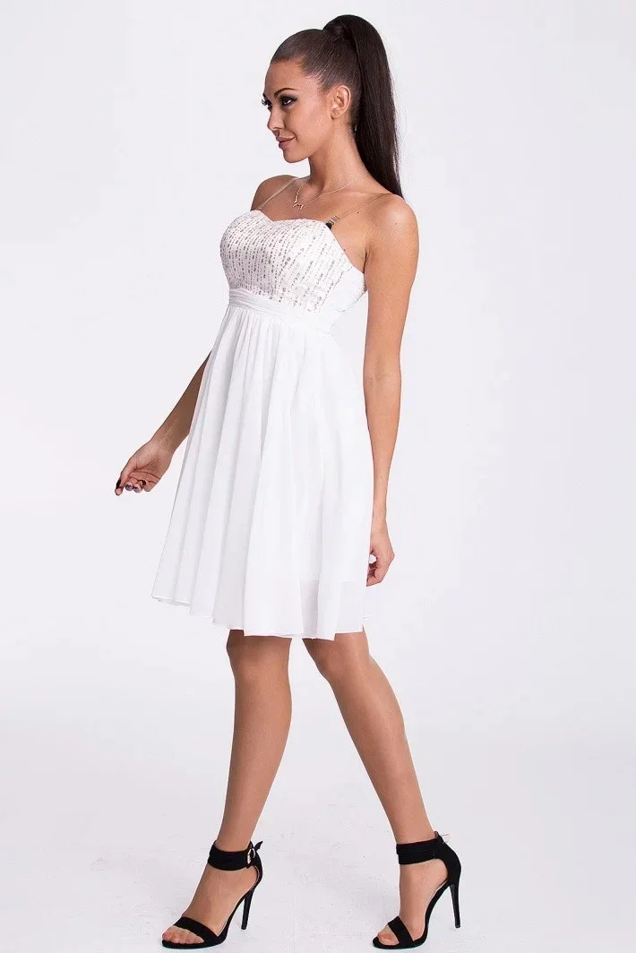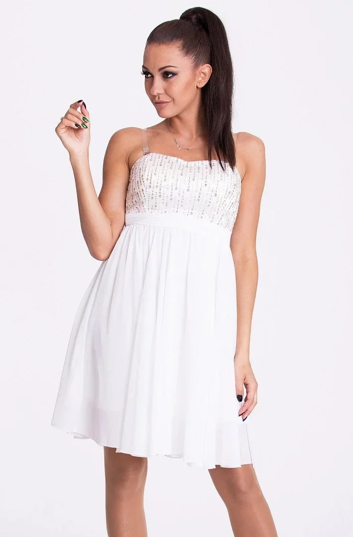 Dámské šaty s rozšířenou sukní a zlatou dekorací. V zadní partii pružné žabičkování, které umožní šatům se přizpůsobit postavě. Lze nasadit i bílá ramínka, která jsou šatů přiložena.