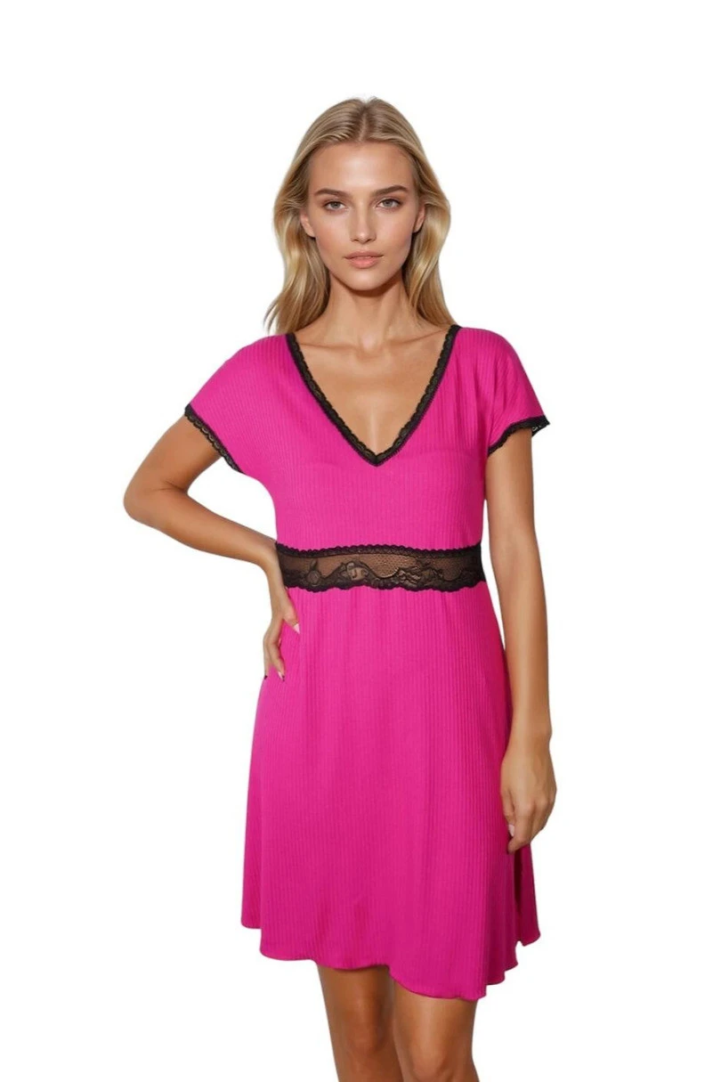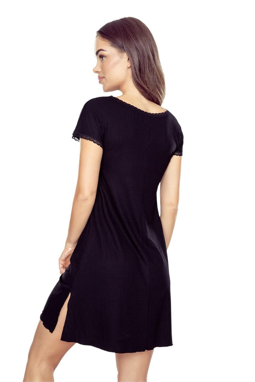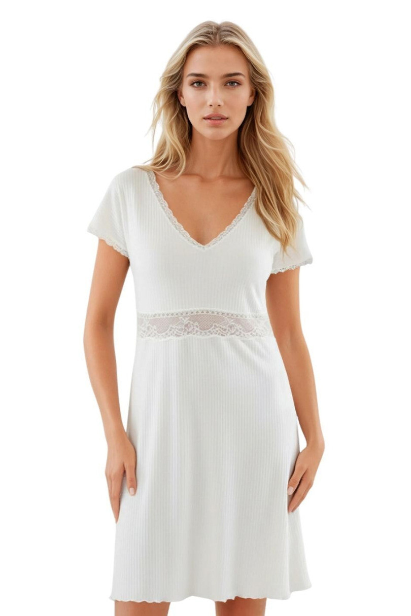 Noční košile First Lady Evana je jedinečným spojením jemné elegance a každodenního pohodlí. Je vyrobena z jemné, prodyšné viskózy s jemným proužkovým vzorem, dokonale se přizpůsobuje siluetě a poskytuje příjemný pocit hebkosti na pokožce. Díky lehké, pružné tkanině je model ideální jak v létě, tak po celý rok. Výstřih ve tvaru písmene V a krátké rukávy jsou zakončeny ažurovou stuhou, která dodává košili ženský půvab. Pas zdobí nápadná krajková vsadka, která jemně zvýrazňuje postavu a dodává celku smyslný charakter. Další rozparky ve spodní části zajišťují volnost pohybu a lehkost střihu. Noční košile First Lady Evana je zabalena v elegantní krabičce, díky které je ideální jako nápad na dárek.
