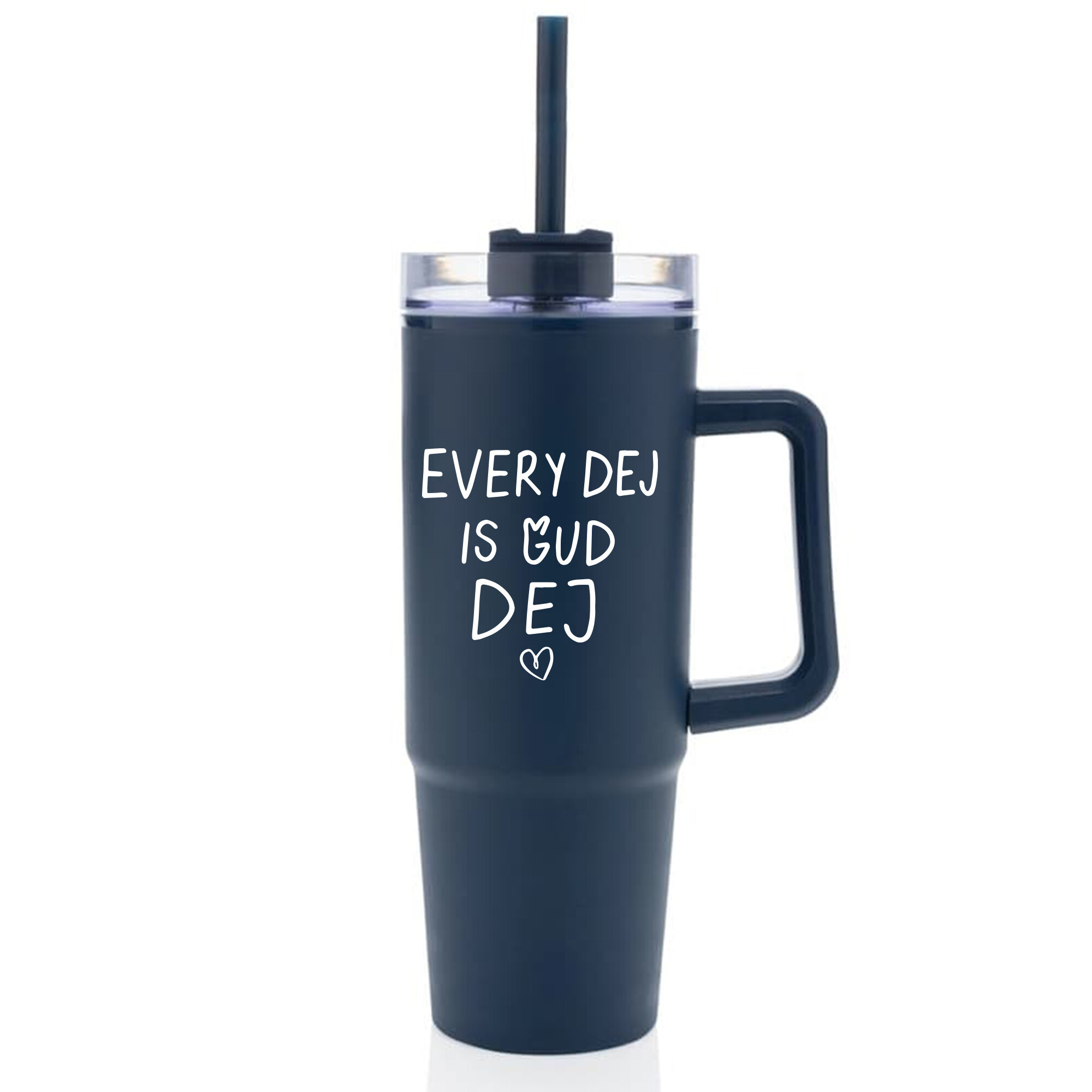 EVERY DEJ IS GUD DEJ - tmavě modrý cestovní hrnek s průhledným víčkem 900 ml