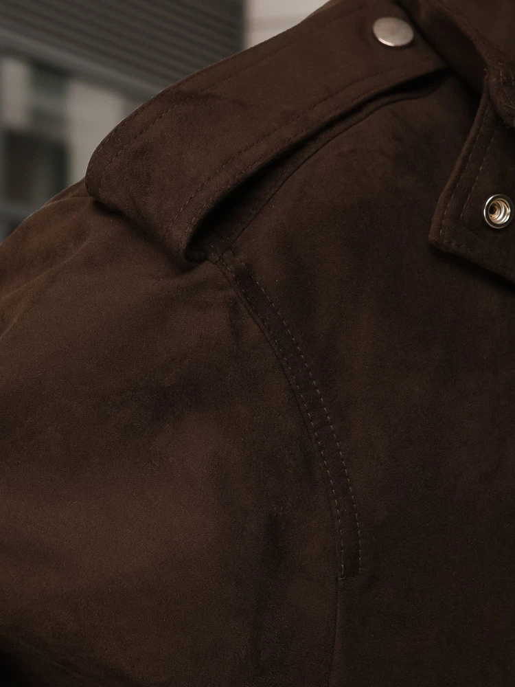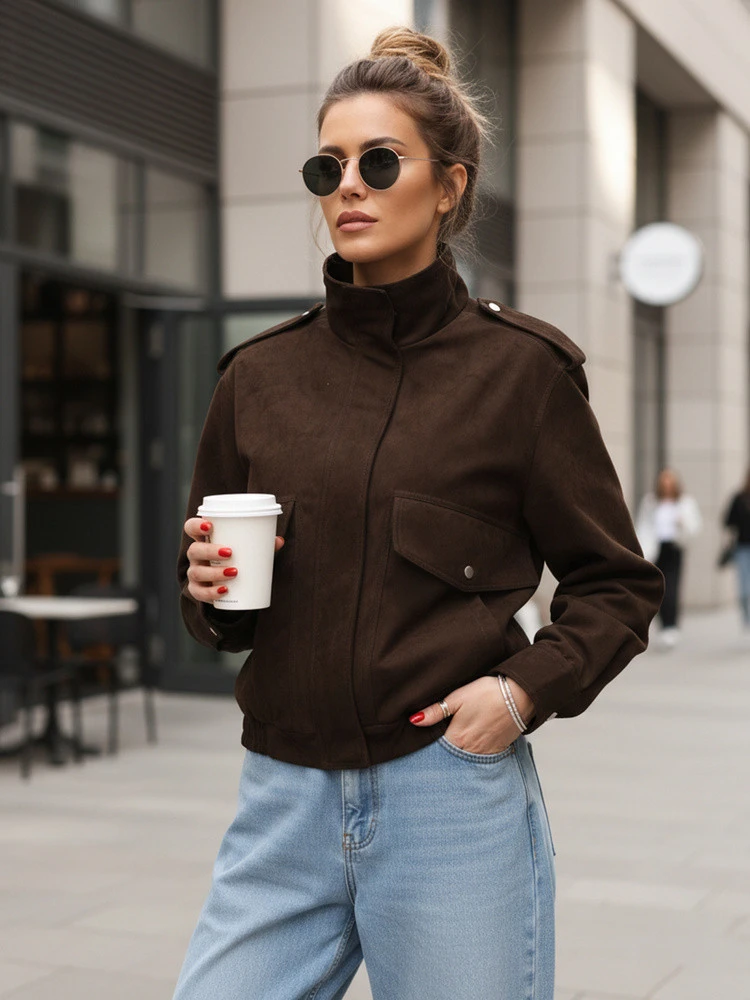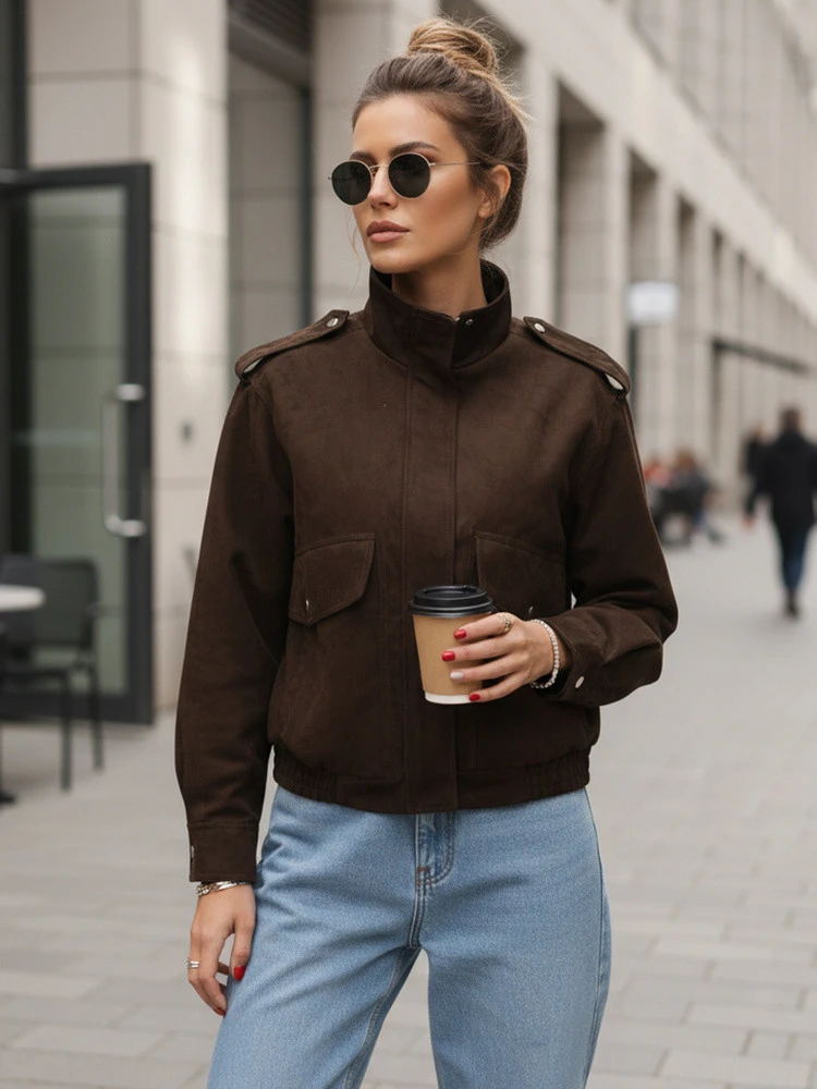 Tato bunda se díky své krátké délce a klasickému střihu osvědčuje jako praktický oděv pro přechodné období. Je vyrobena z imitace semiše a kombinuje estetický vzhled s pohodlným nošením. Vysoký límec a nastavitelný spodní lem jí dodávají strukturovaný vzhled a zvyšují ochranu před chladem. Kapsy dodávají funkčnost pro každodenní použití.