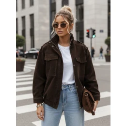 Dámská bunda s mírně nadměrným střihem bomber, vyrobená z materiálu imitujícího semiš, je virálním hitem sezóny. Krátký střih a zvýšený stojáček dodávají celku moderní, městský charakter. Design kombinuje volnost nošení se strukturovanou formou, díky čemuž je vhodný pro každodenní nošení. Model se dobře hodí k ležérnímu i smart casual stylu.