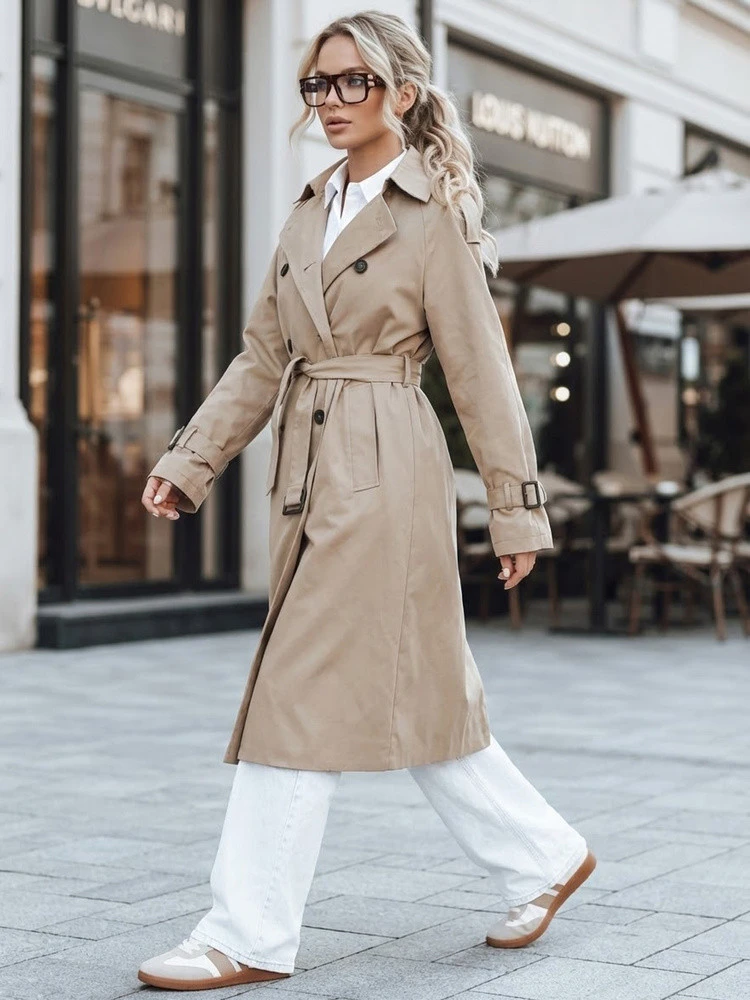 Tento dámský trenčkot má klasický, nadčasový design s dvouřadým zapínáním a páskem v pase. Hladká konstrukce zvýrazňuje siluetu a udržuje elegantní styl. Lehký materiál se dobře osvědčuje v přechodném období pro pohodlí při každodenním nošení a střih se dobře hodí k městskému a kancelářskému stylu.