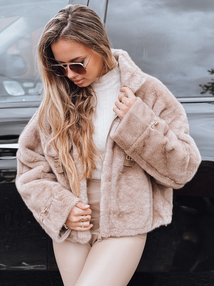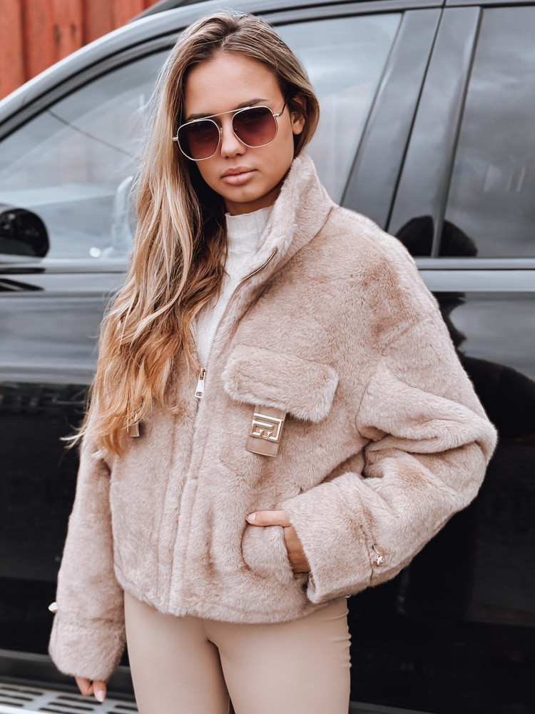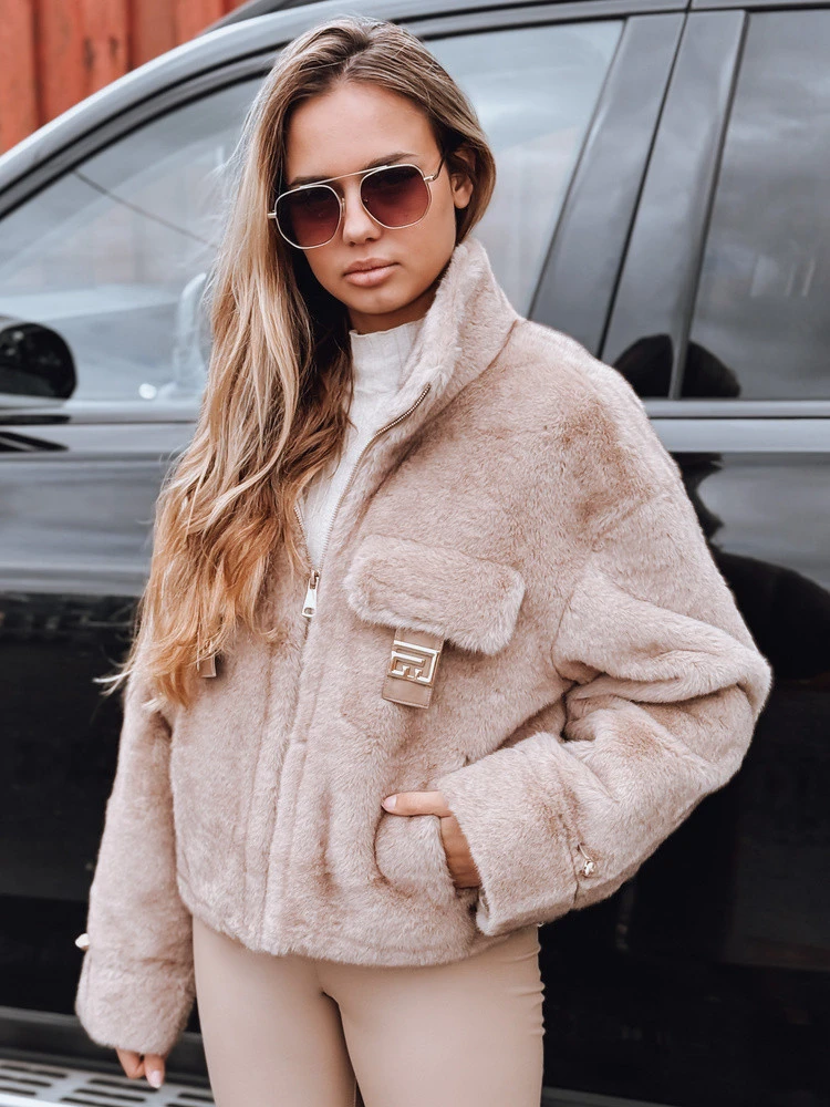 Dámský kožich krátkého střihu v délce přes boky je elegantní nabídkou pro chladnější dny. Je vyroben z měkkého materiálu a poskytuje komfort a pohodlí při nošení. Model se zapínáním na zip byl doplněn praktickými kapsami a ozdobnými nášivkami, které podtrhují charakter celku.