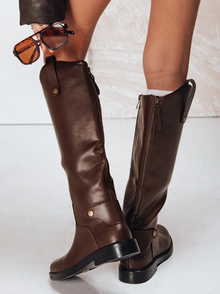 Klasické vysoké kozačky z měkké ekologické kůže jsou ideální volbou pro ženy, které si cení elegance a pohodlí. Hladký svršek s jemným leskem krásně sedí na noze, zatímco ozdobné prošívání a boční pásek s přezkou dodávají stylové zakončení. Díky plochému podpatku je model ideální pro každodenní styling - poskytuje stabilitu a pohodlí po celý den.
