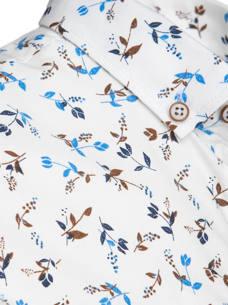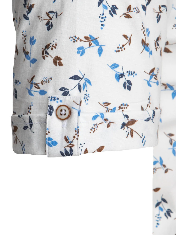 Tato pánská košile s krátkým rukávem slim fit střihu je skvělou volbou pro teplejší měsíce. Listový a květinový vzor dodává košili svěžest a charakter, zatímco knoflíkový límec a zapínání na knoflíky jí dodávají elegantní vzhled. Ideální pro ležérní i elegantní styling - ideální na jarní schůzky nebo letní výlety.
