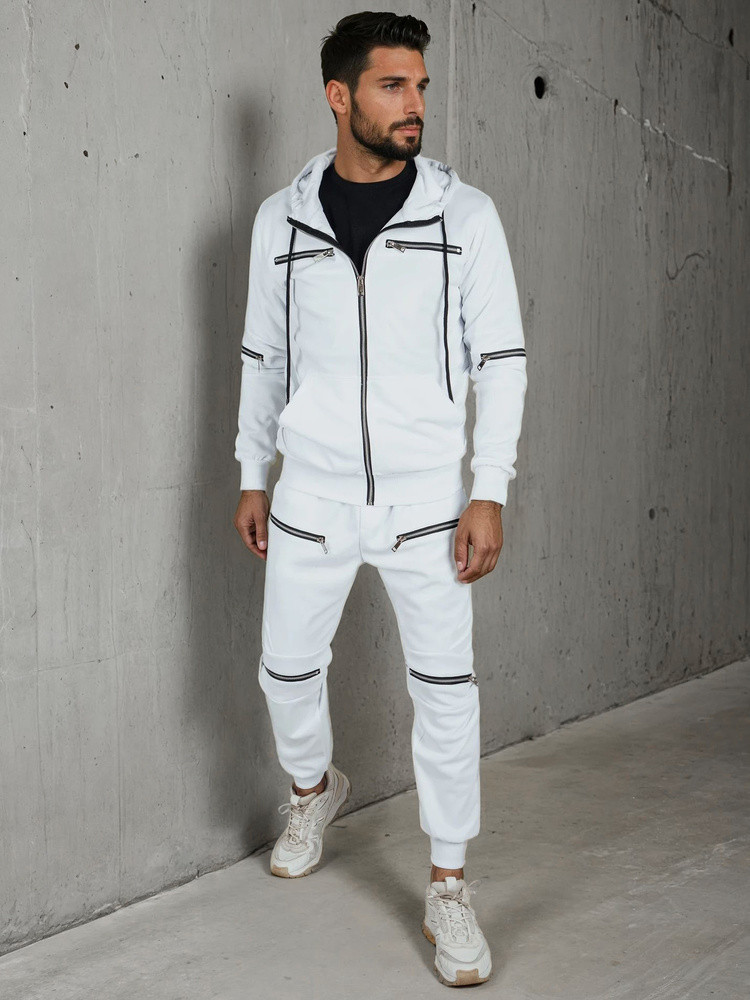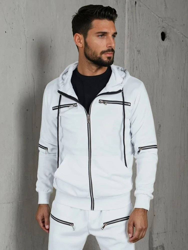 Pánská tepláková souprava s kapucí, stahovací šňůrkou v pase a kalhotami, s kovovými zipy na hrudi, rukávech a nohavicích, sportovním stylem se streetwearovým nádechem a strečovou tkaninou pro pohodlné nošení, ideální na každodenní nošení na jaře i na cestu na trénink.
