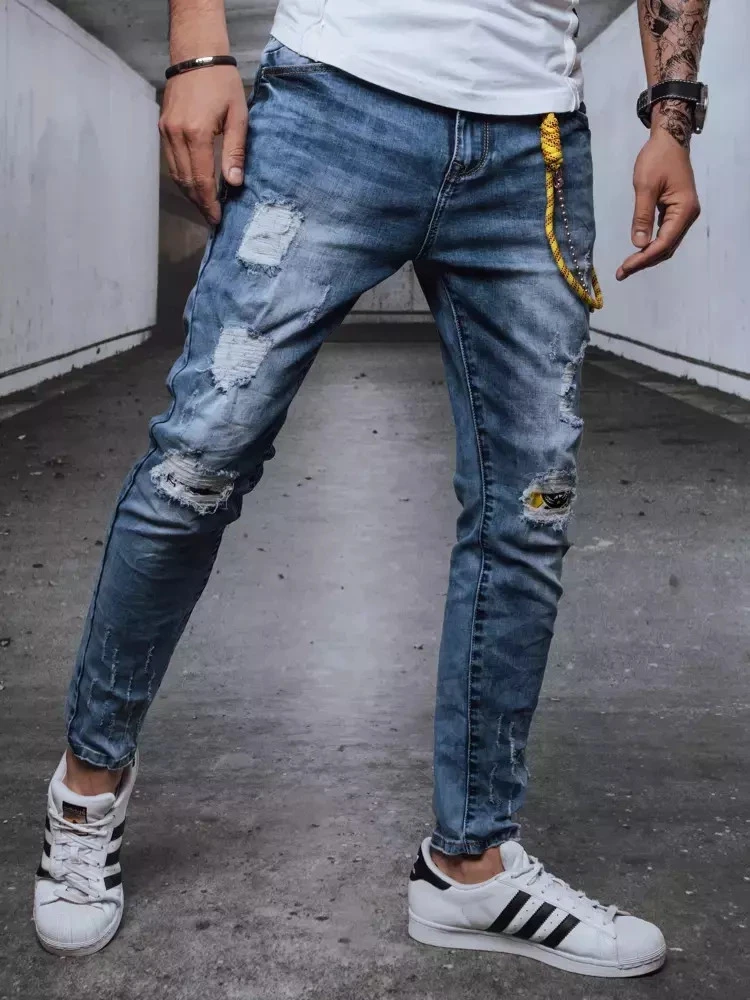 Pánské skinny džíny střihu na míru, které kombinují moderní vzhled s pohodlím při každodenním nošení. Model je vyroben ze strečového denimu, dobře padne a neomezuje v pohybu. Charakteristické odírání a ozdobný řetízek dodávají celku výrazný, městský charakter.