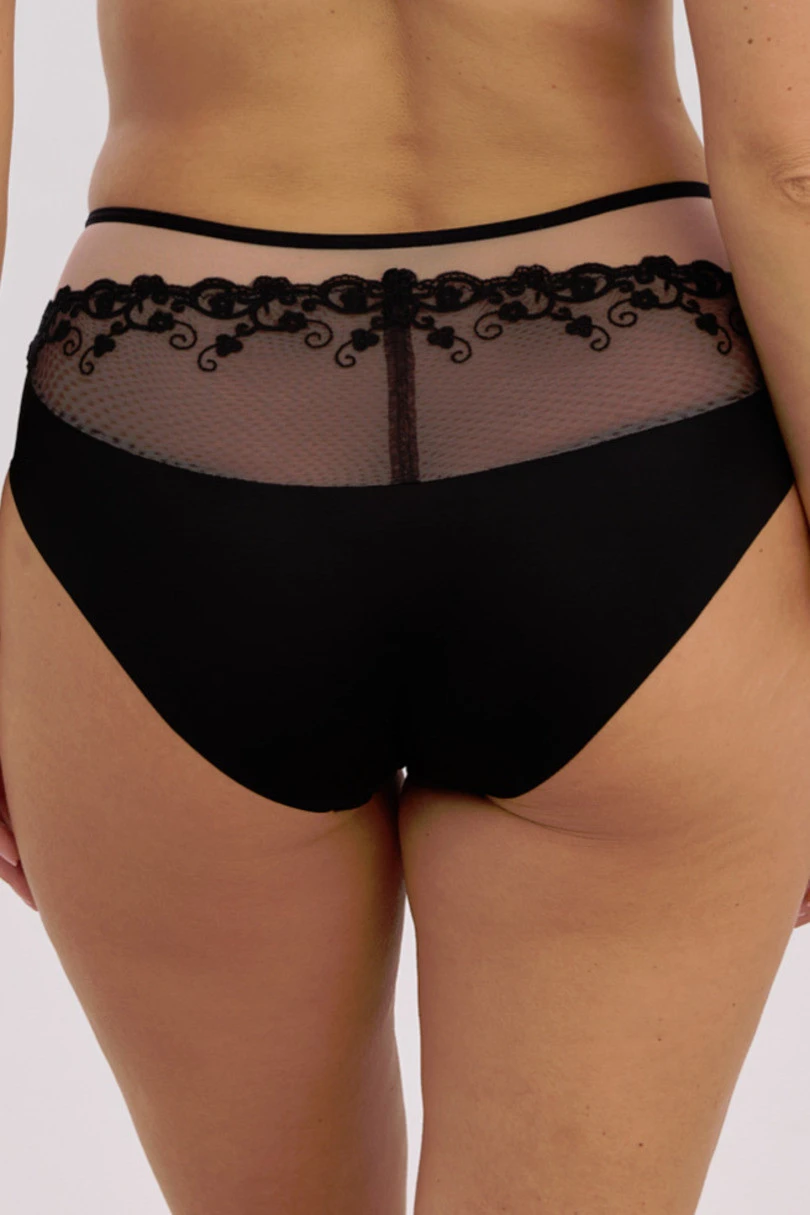 Wyrafinowane czarne figi z haftowanym tiulem to idealne połączenie elegancji i wygody. Przód ozdobiony delikatnym, przezroczystym tiulem z bogatym czarnym haftem o roślinnym motywie, który subtelnie podkreśla kobiece kształty. Tył wykonany z gładkiej, elastycznej mikrofibry, zapewnia komfort i perfekcyjne dopasowanie. Niewielka satynowa kokardka w pasie dodaje całości romantycznego charakteru.