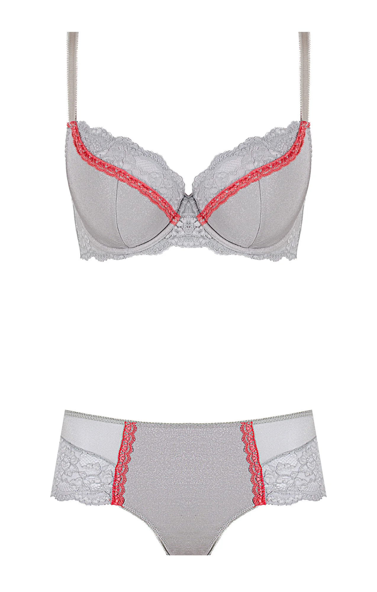 Festival II je podprsenka ušitá z jemně třpytivé stříbrné látky. Vypadá stylově a velmi elegantně. Horní část košíčků je z duetové krajky v krásné korálové barvě, spodní část je hladká. Zde je aranžmá hodné ženy, která se chce cítit výjimečně. Vynikající (polovyztužená) konstrukce podprsenky se bude dobře hodit pro větší a těžší prsa, která potřebují pořádně pozvednout a smyslně modelovat. Vytváří smyslný výstřih. Nastavitelné popruhy. Mezi poháry jsou drahokamy. Skutečný klenot mezi podprsenkami, noste ji a uvidíte sami!