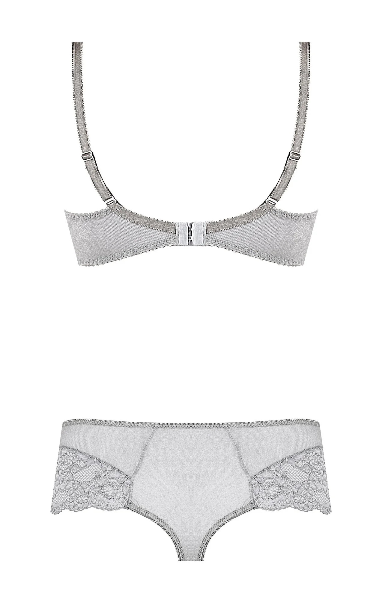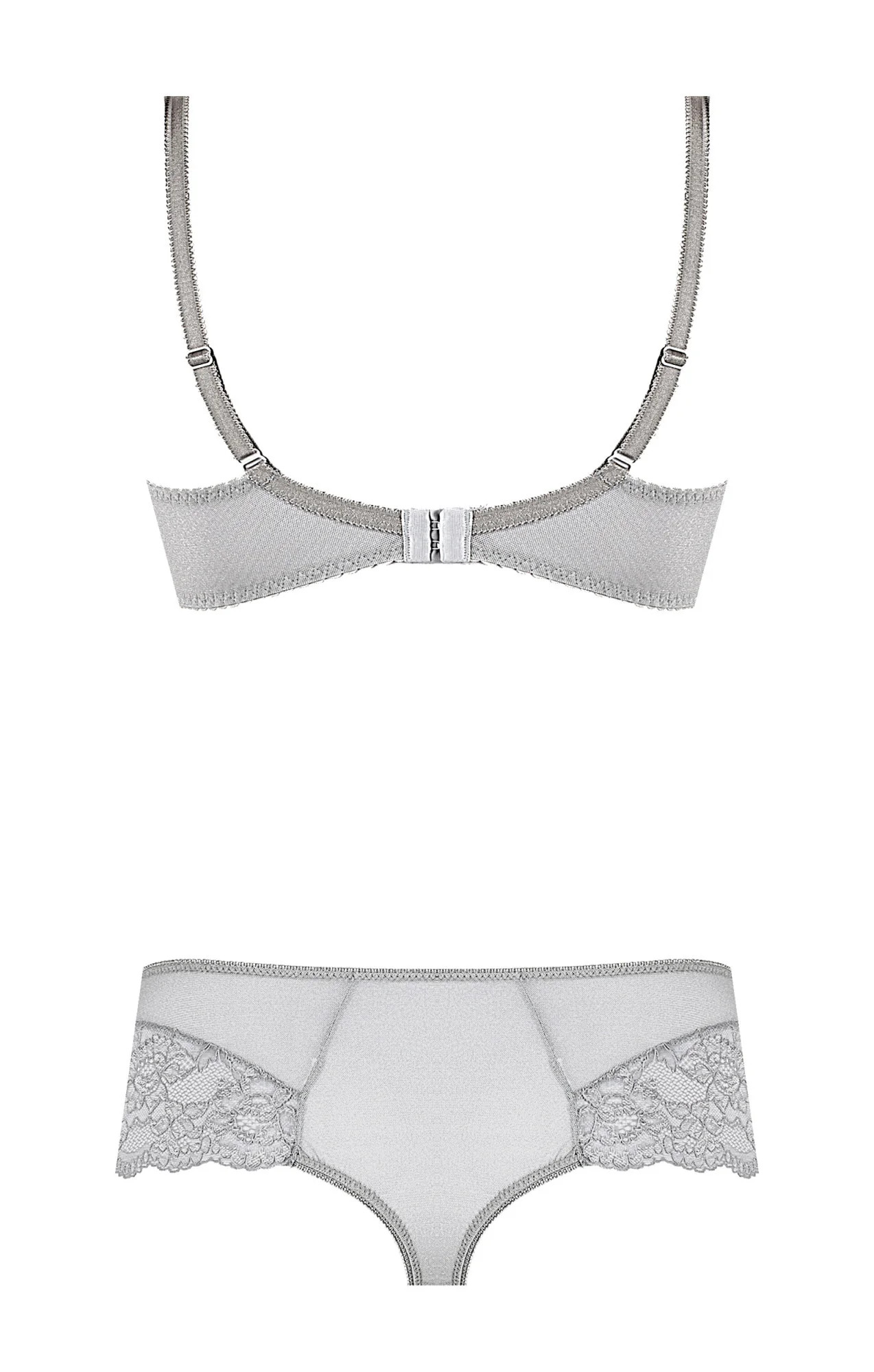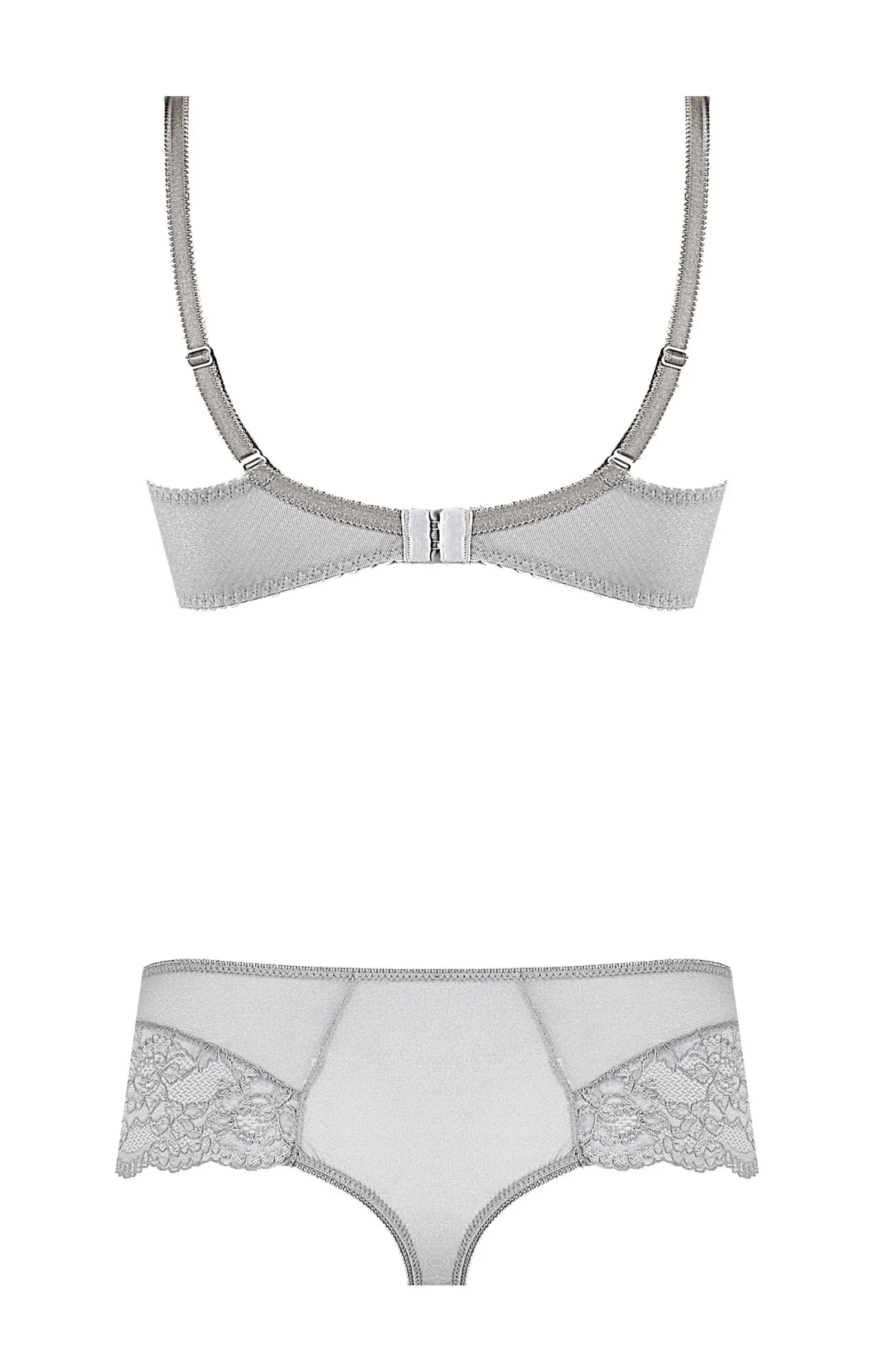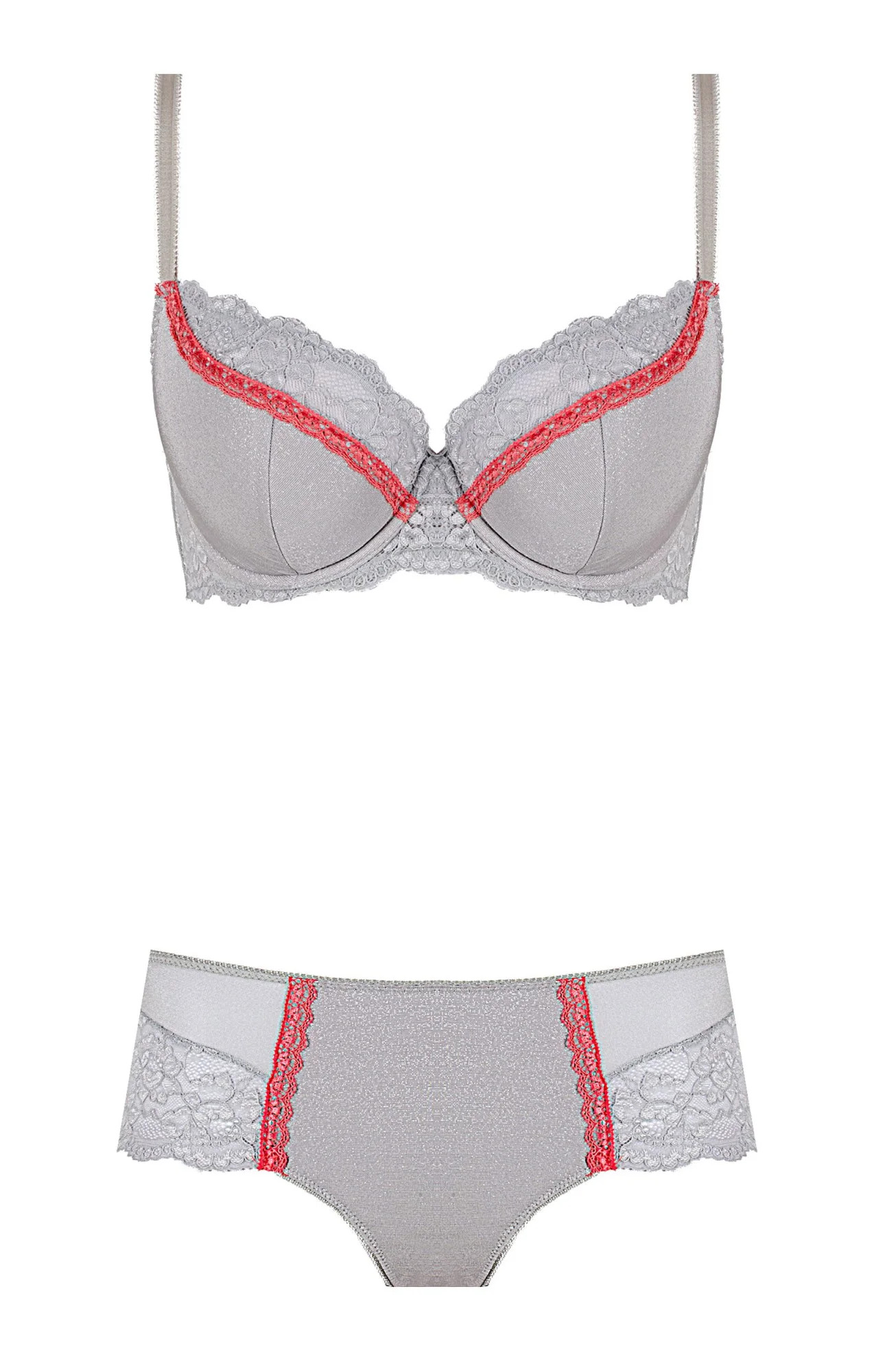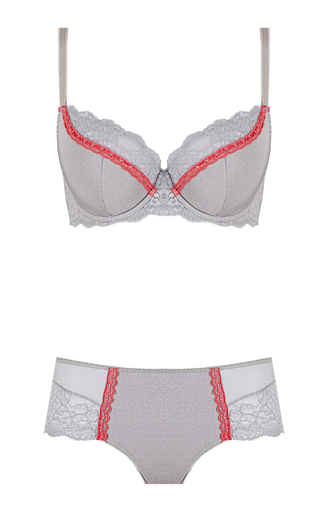 Festival II je podprsenka ušitá z jemně třpytivé, stříbřité látky. Působí stylově a velmi elegantně. Horní část košíčků v duetu krajky v krásné, korálové barvě, spodní část hladká. To je úprava hodná ženy, která se chce cítit výjimečně. Nádherná, (polovyztužená) konstrukce podprsenky se osvědčí u větších, těžších prsou, která vyžadují řádné zvednutí a smyslnou modelaci. Vytváří smyslný dekolt. Nastavitelná ramínka. Mezi košíčky jsou umístěny bižuterní krystalky. Skutečný skvost mezi podprsenkami, oblečte si ji a uvidíte sami!