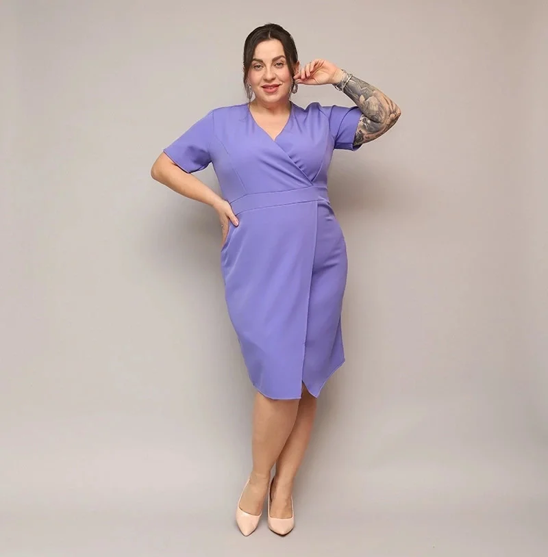 Fialové dámské přeložené obálkové šaty v délce ke kolenům (743)
