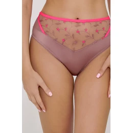 Figi AV 2217 z wysokim stanem wysmuklają talię dzięki transparentnemu panelowi z haftem, a ich gładki tył otula sylwetkę, gwarantując swobodę ruchów. Wersja brazylian to bardziej odważna odsłona – wycięty tył subtelnie eksponuje pośladki, zachowując przy tym elegancję i komfort.