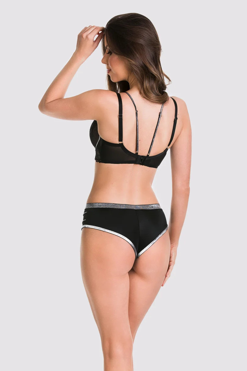 Přední díl s krajkou, stříbrný elastický pás, boky zdobené tenkými proužky našitými na tylu, zadní díl z černého mikrovlákna.