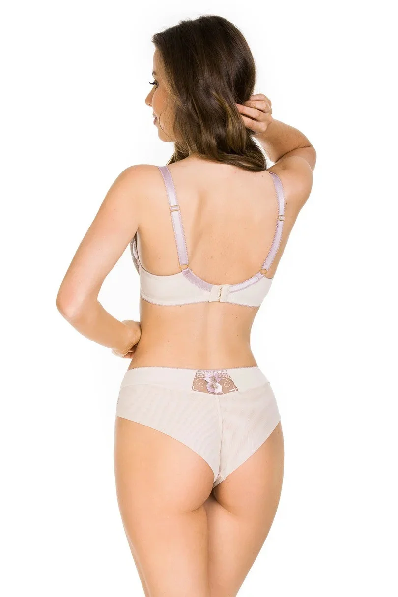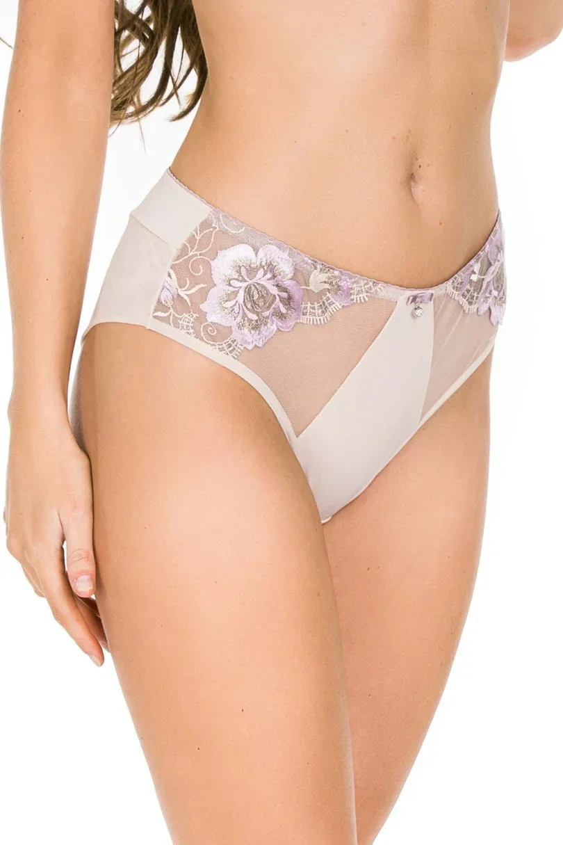 Klasické kalhotky s plnějším střihem, předním dílem z mikrovlákna, síťovanými boky a výšivkou s květinovým motivem a zlatou nití.
