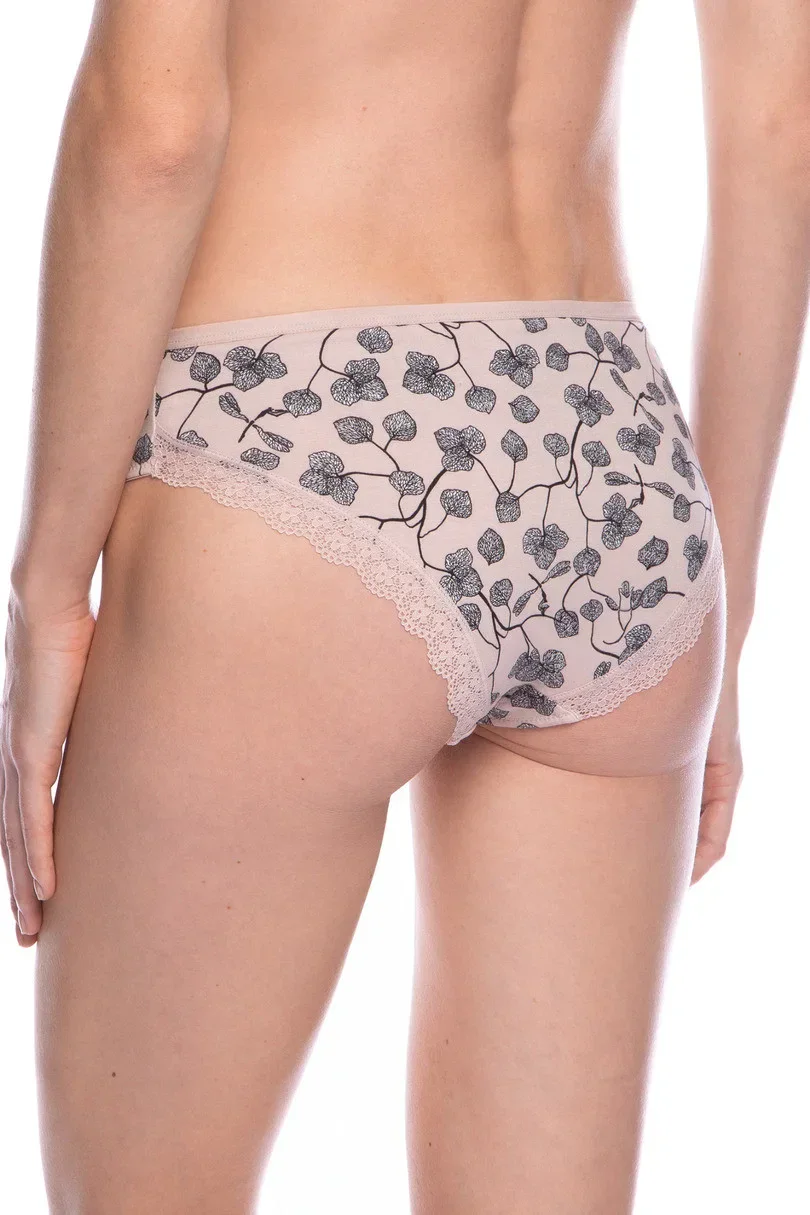 Dámské bavlněné kalhotky. V balení po 2 kusech, jeden hladký, druhý s potiskem, vzadu zakončený jemnou krajkou.