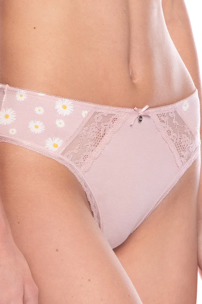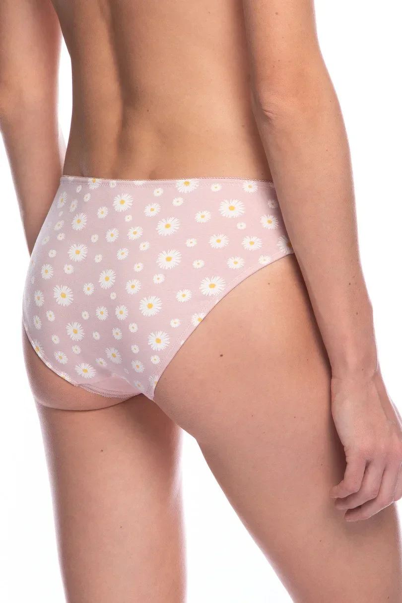 Dámské bavlněné kalhotky. V balení po 2 kusech, jeden hladký, druhý s potiskem, vzadu zakončený jemnou krajkou.