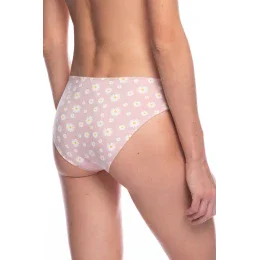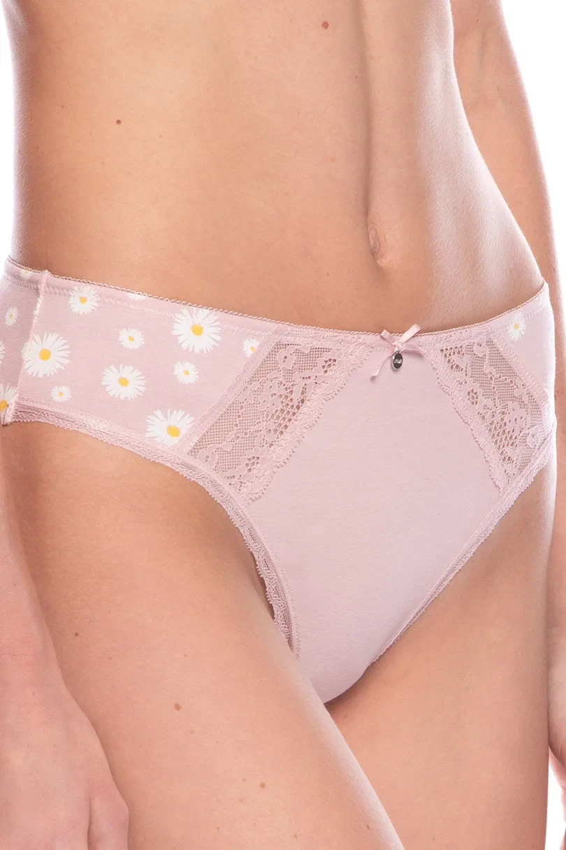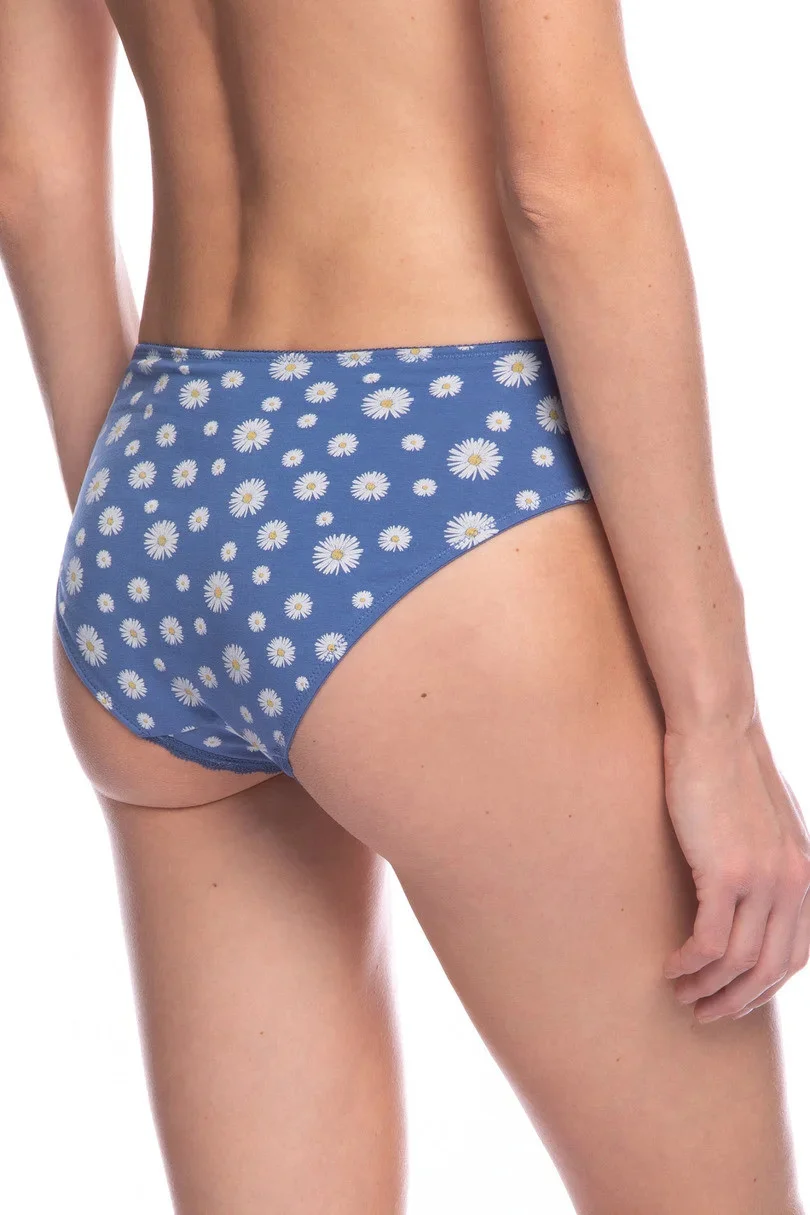 Dámské bavlněné kalhotky. V balení po 2 kusech, jeden hladký, druhý s potiskem, vzadu zakončený jemnou krajkou.