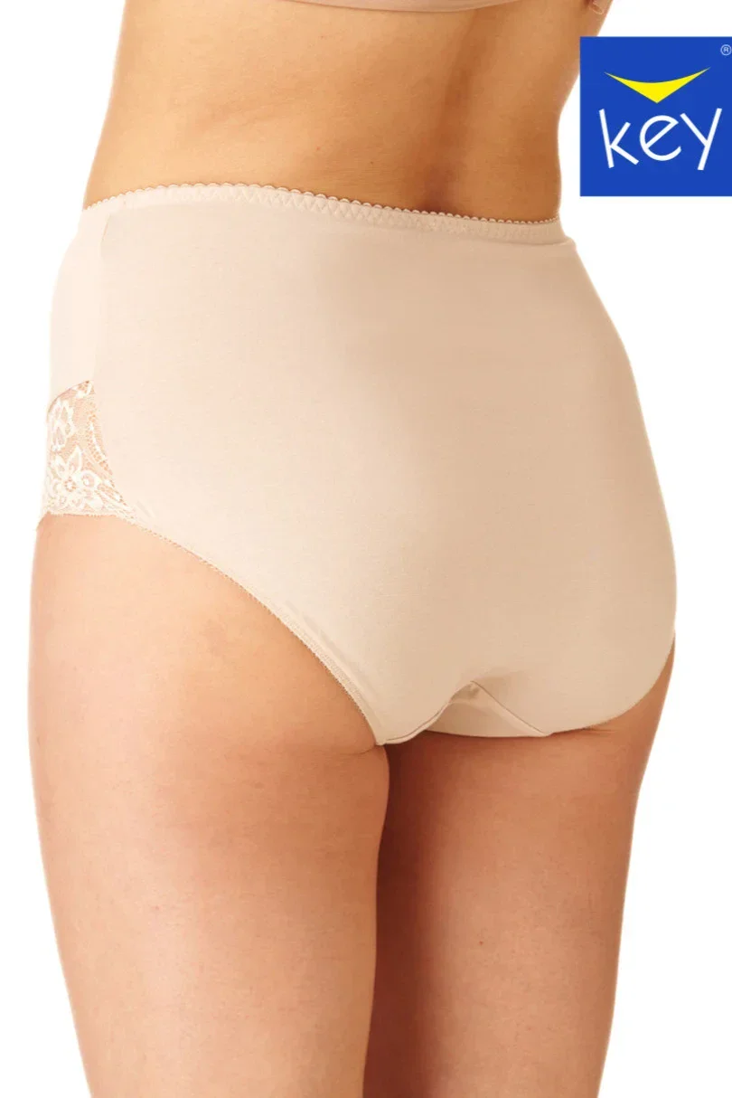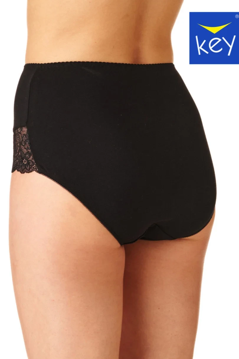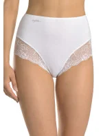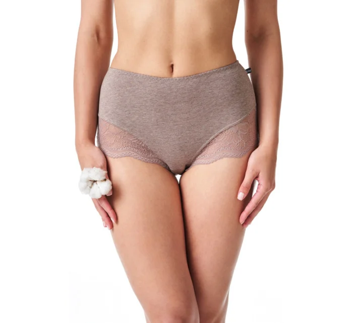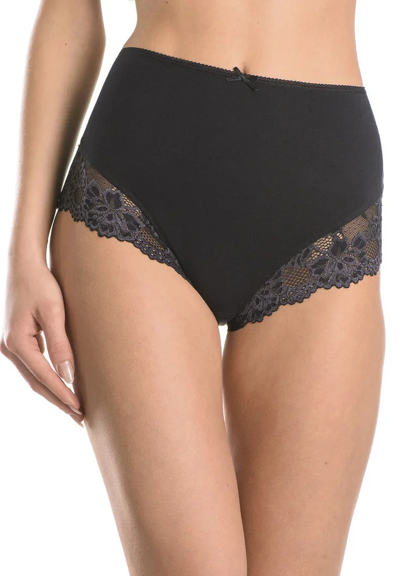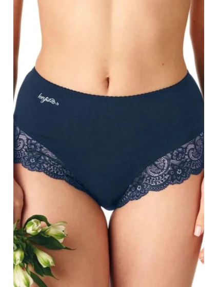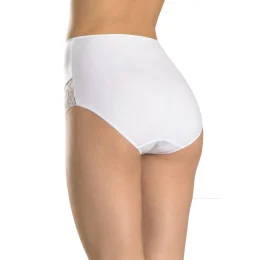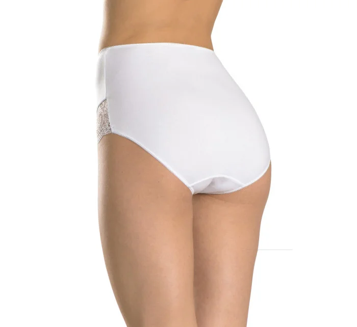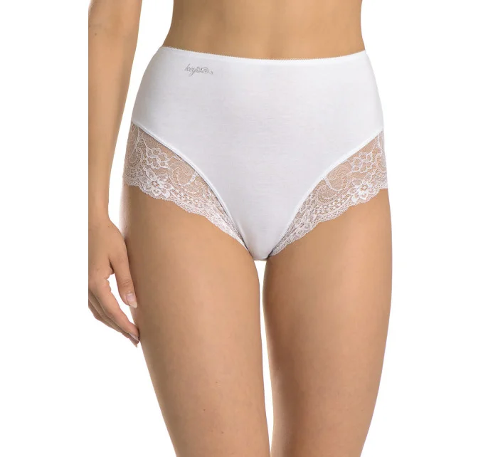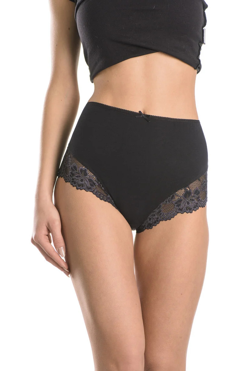 Figi damskie bikini o wysokim stanie i bardzo szerokim boku,w pełni okrywa brzuch i biodra, ozdobne koronkowe wstawki Skład: 95% bawełna, 5% elastan Figi pakowane są po 2 szt. Cena dotyczy jednego opakowania.