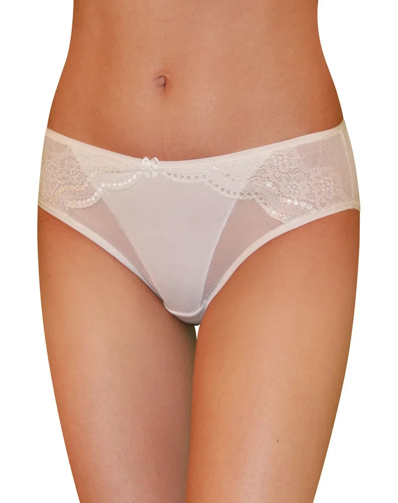 Figi damskie o klasycznym kroju midi bikini. Boki zabudowane, przód ozdobiony wstawkami koronki o kwiatowym motywie i elastycznej siateczki.