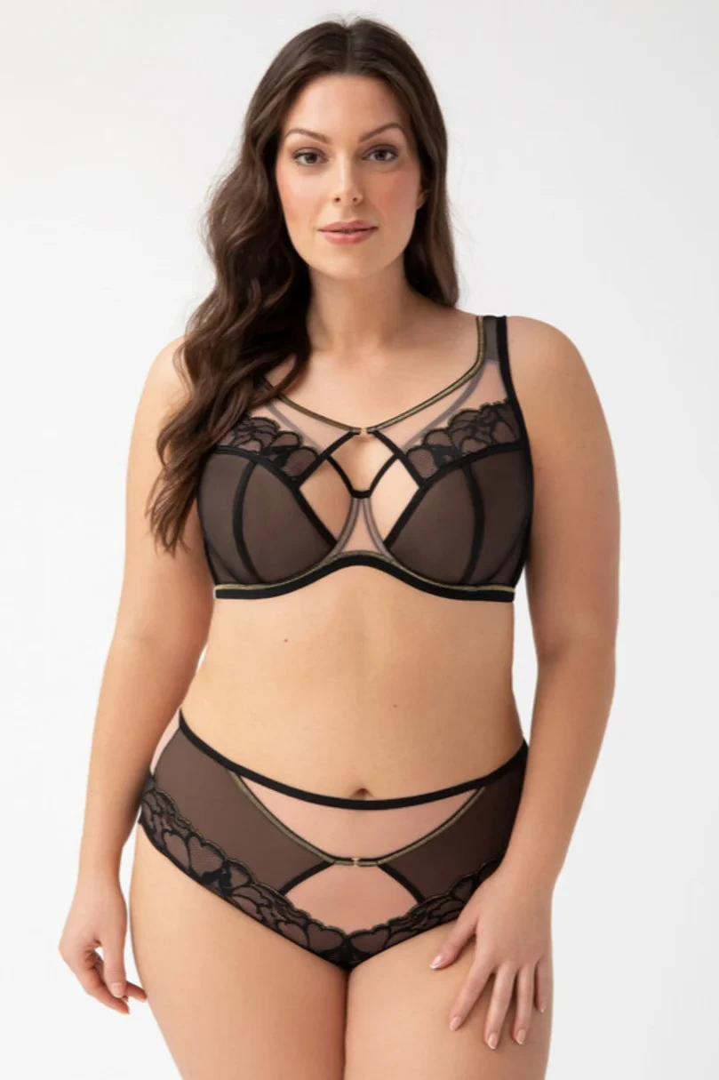 PRZÓD: dolna część z koronki elastycznej, u góry wstawki z kabaretki obszyte taśmą łamaną z ozdobnym przeszyciem i regulatorem, całość podszyta tiulem elastycznym, nogawki wykończone wąską taśmą elastyczną