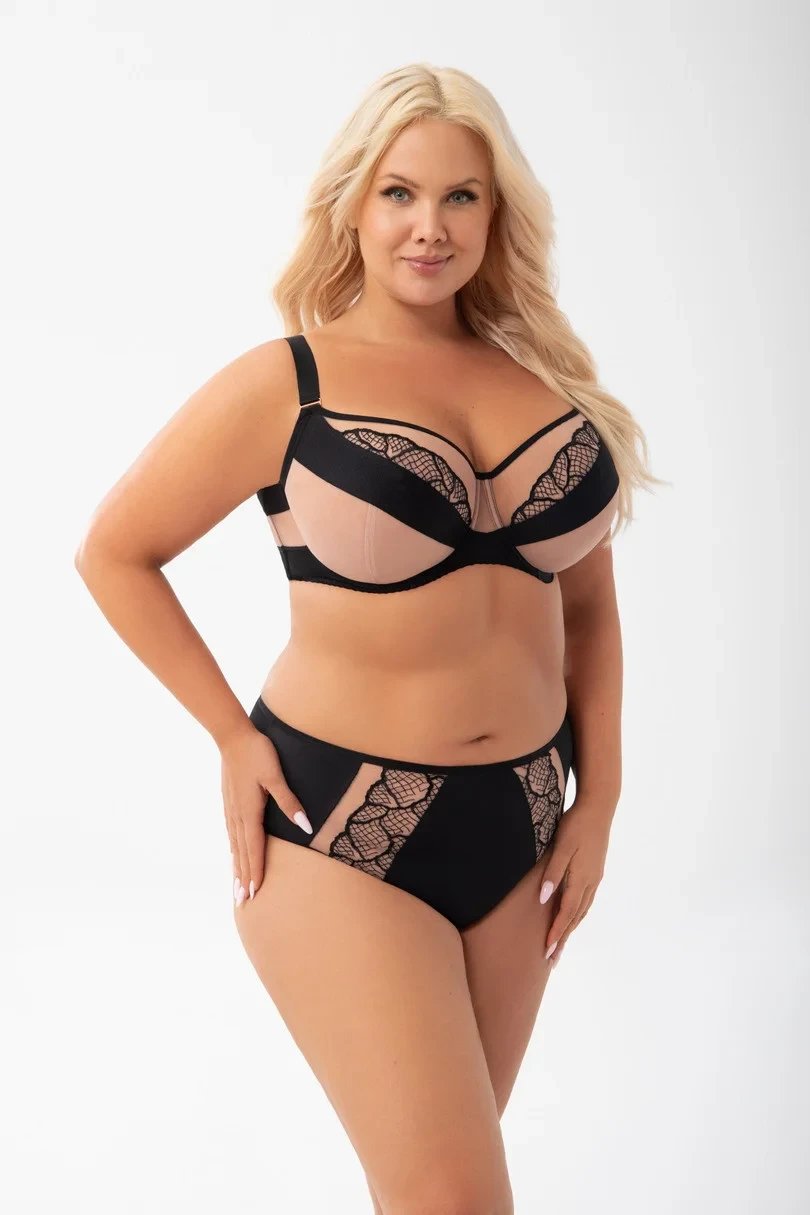 Wyższy stan, zabudowany fason zasłaniający prawie całe pośladki. Wykonane z kryjącej microfibry, z przodu wstawki z haftu podszytego z tiulem stabilnym. Wykonane z kryjącej microfibry, z przodu wstawki z haftu podszytego z tiulem stabilnym. Tył wykończony poprzez podwinięcie krawędzi microfibry na płasko.Bawełniany kroczek.