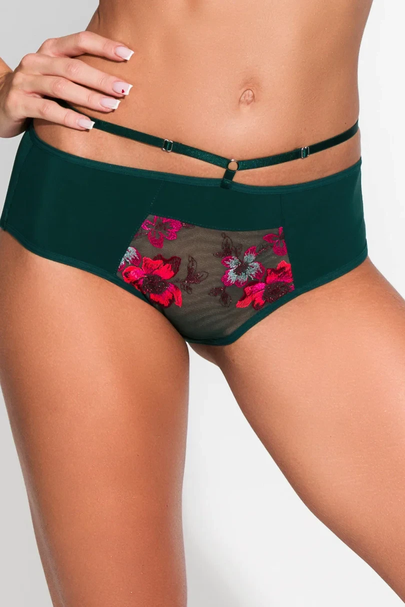 Figi Pełne Verde w głębokim odcieniu szmaragdowym to harmonijne połączenie klasyki i elegancji, idealne dla kobiet ceniących zarówno komfort, jak i stylowy wygląd. Fason o wyższym stanie choć zdjęcie tego nie oddaje, ozdobione delikatnym paseczkiem w talii, subtelnie podkreśla sylwetkę, dodając wdzięku i pewności siebie. Figi zostały wykonane z miękkiej, mięsistej mikrofibry oraz tiulu, co nadaje im delikatny, kobiecy charakter. Przód zdobi siatka z kwiatowym wzorem, co dodaje figom unikalnego, dekoracyjnego akcentu.