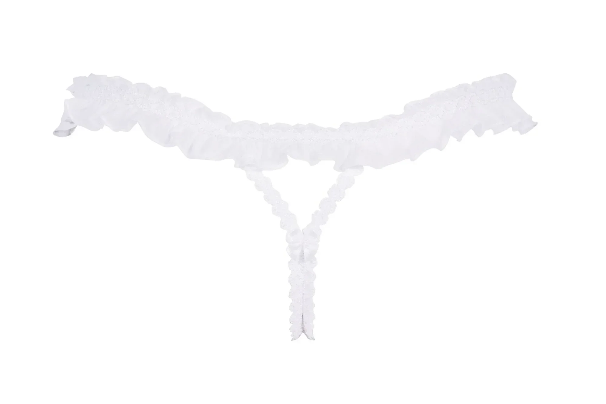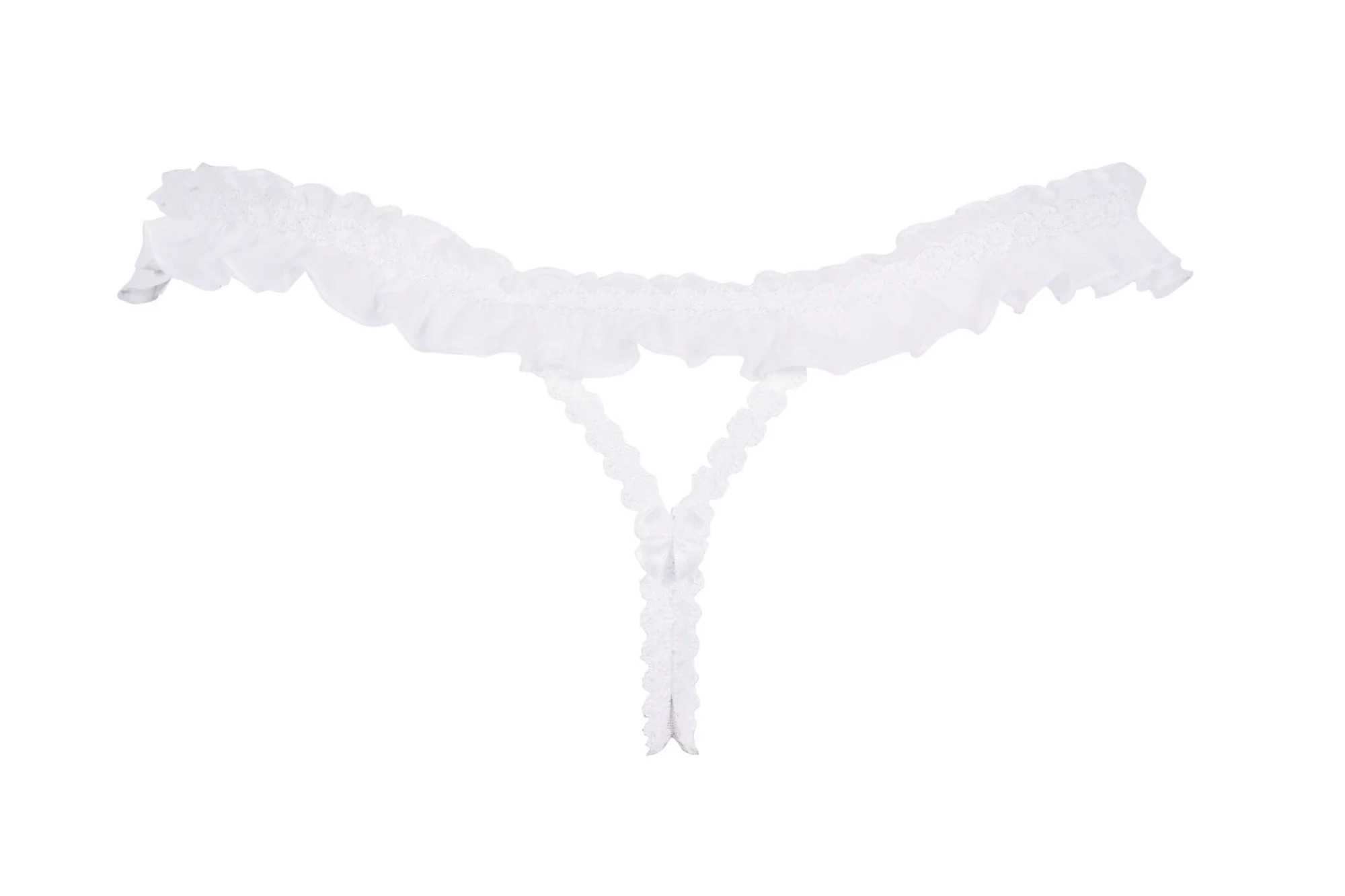 Bílá, sladké pokušení. Igazi jsou krajková tanga, která navenek vypadají velmi nevinně - volánek na bocích, mašličky a krajka s krásným ažurovým vzorem. Ve skutečnosti jde o velmi smyslné aranžmá - přední část vyzařuje nahotu, kterou doplňuje krásný perleťový kámen s luxusně se třpytícími zirkony.