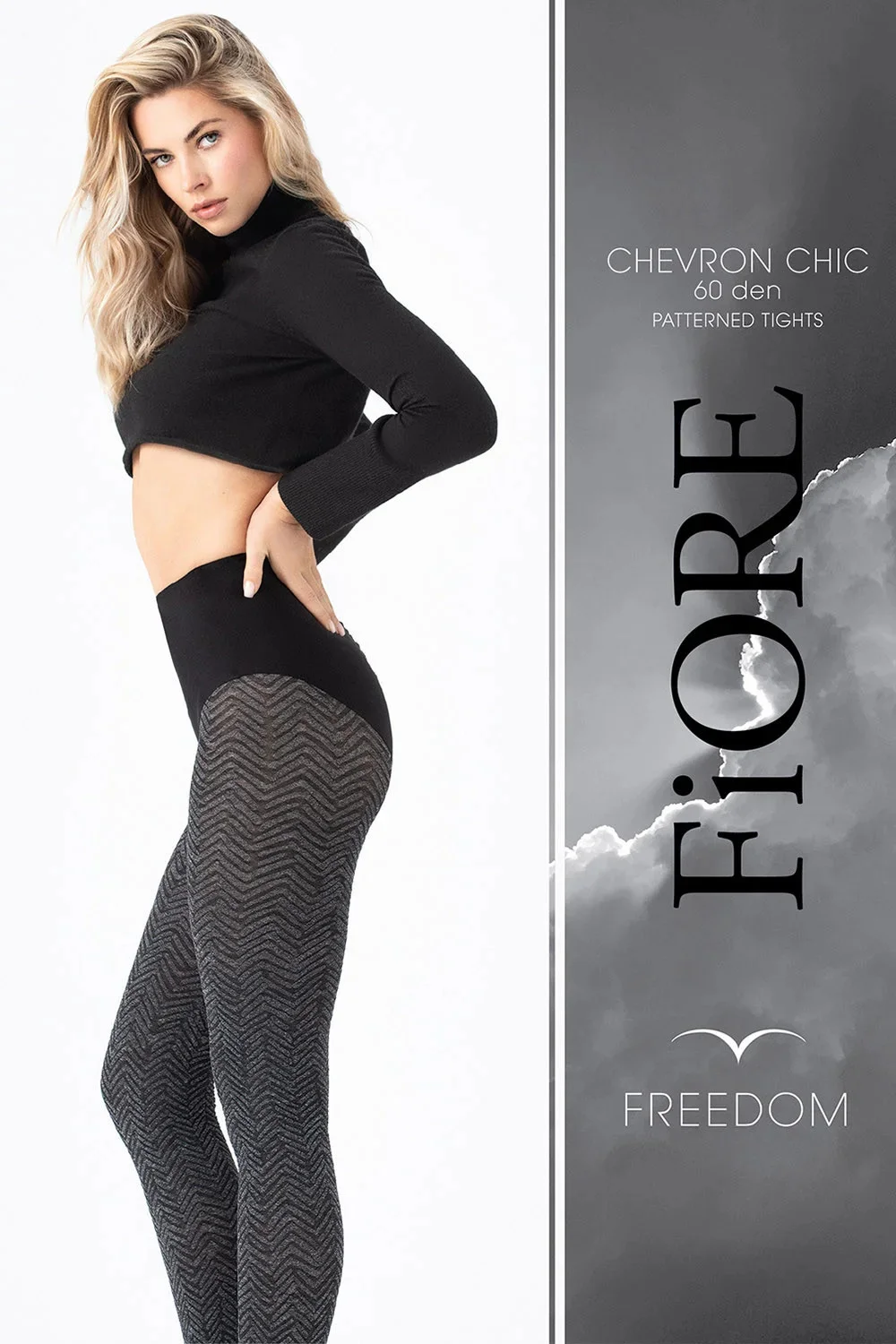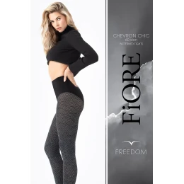 Punčochové zboží značky Fiore. Chevron Chic 60 DEN G6076 model. Výrobek je vyroben z 53 % z polyamidu, 35 % z polyesteru a 12 % z elastanu. Výrobek pro ženy. Tloušťka: 60 DEN. Žádné označené prsty.
