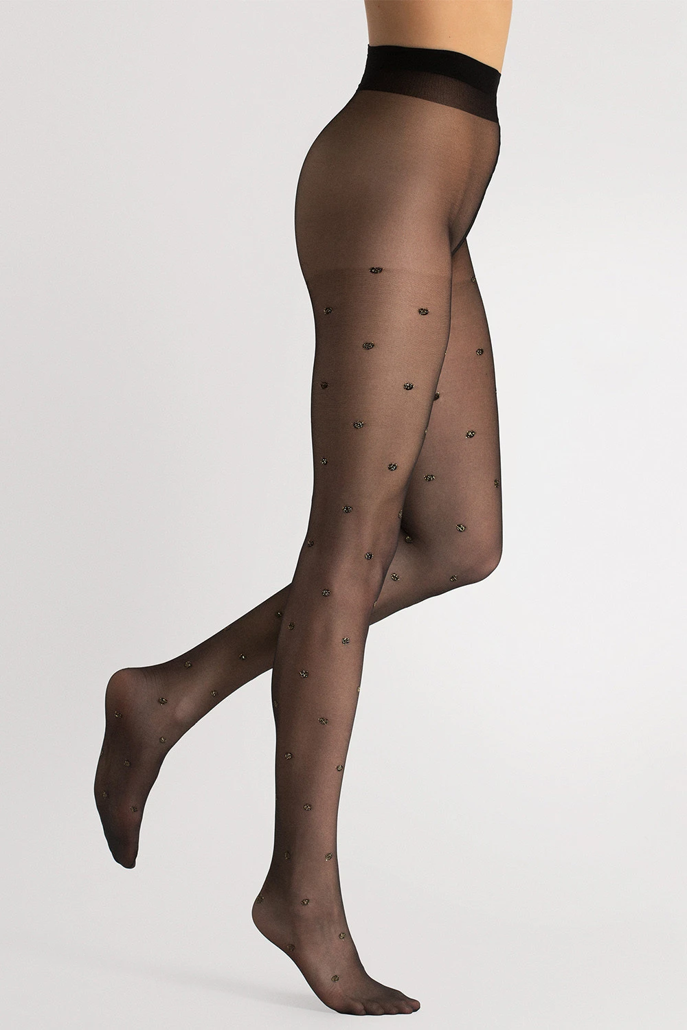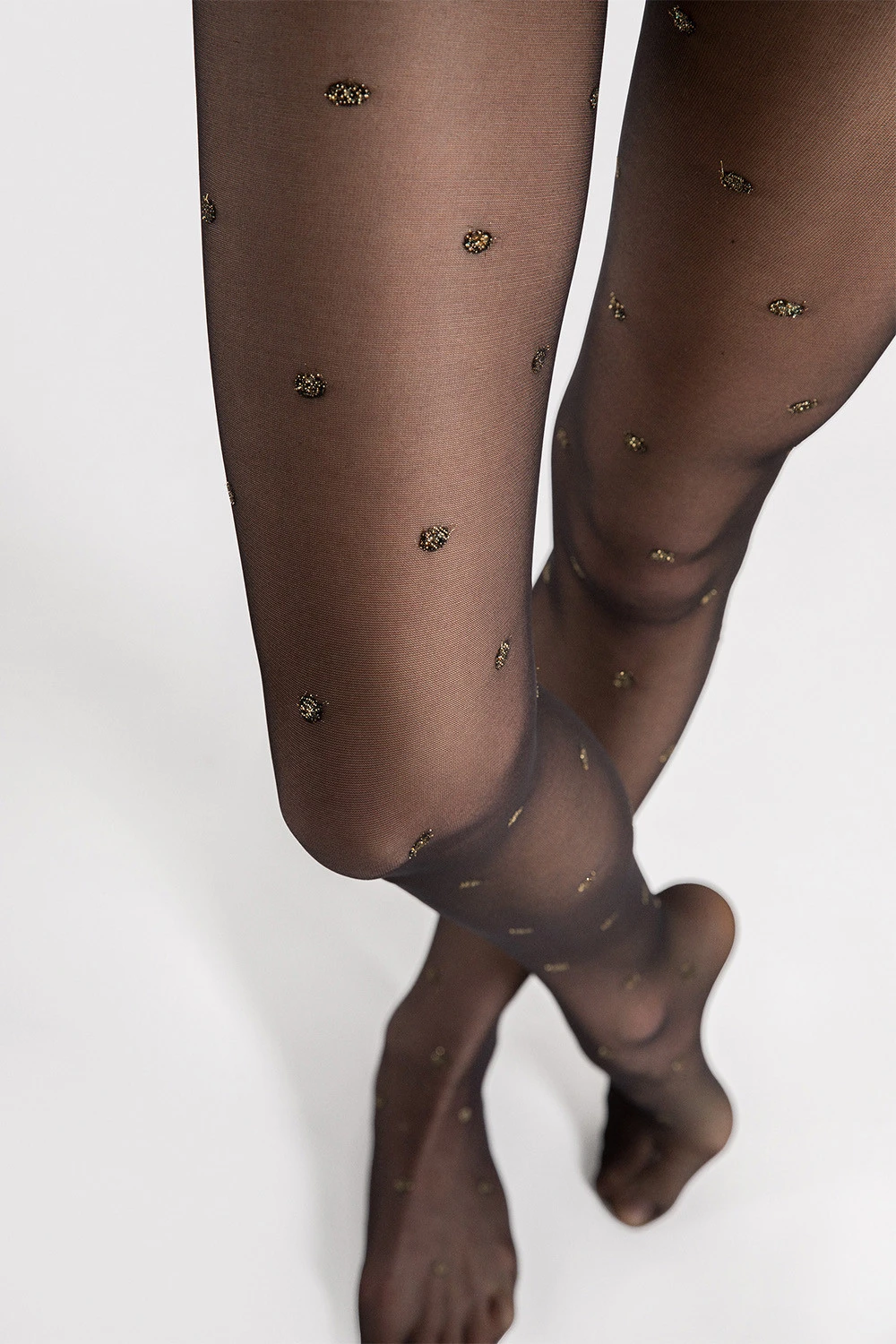 Punčochové zboží značky Fiore, model Confetti 20 DEN G6060, vyrobeno z 87% polyamidu, 10% elastanu, 3% metalizované příze, bez vyznačených špiček, tloušťka: 20 DEN, dámský výrobek.