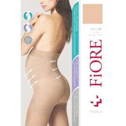 Punčochové zboží značky Fiore. model Mama 20 den M5208. Výrobek je vyroben z 80% polyamidu, 20% elastanu. bez vyznačených špiček. těhotenské oblečení. tloušťka: 20 DEN. dámský výrobek. vyznačená část kalhotek.