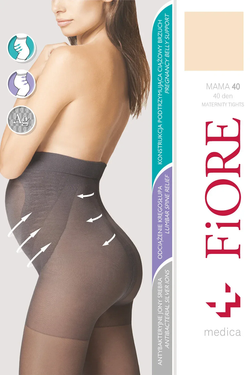 Punčochové zboží značky Fiore. Model Mama 40 den M5209. Výrobek je vyroben z 80 % z polyamidu a 20 % z elastanu. Výrobek pro ženy. Tloušťka: 40 DEN. Žádné označené prsty. Označená sekce kalhotek.