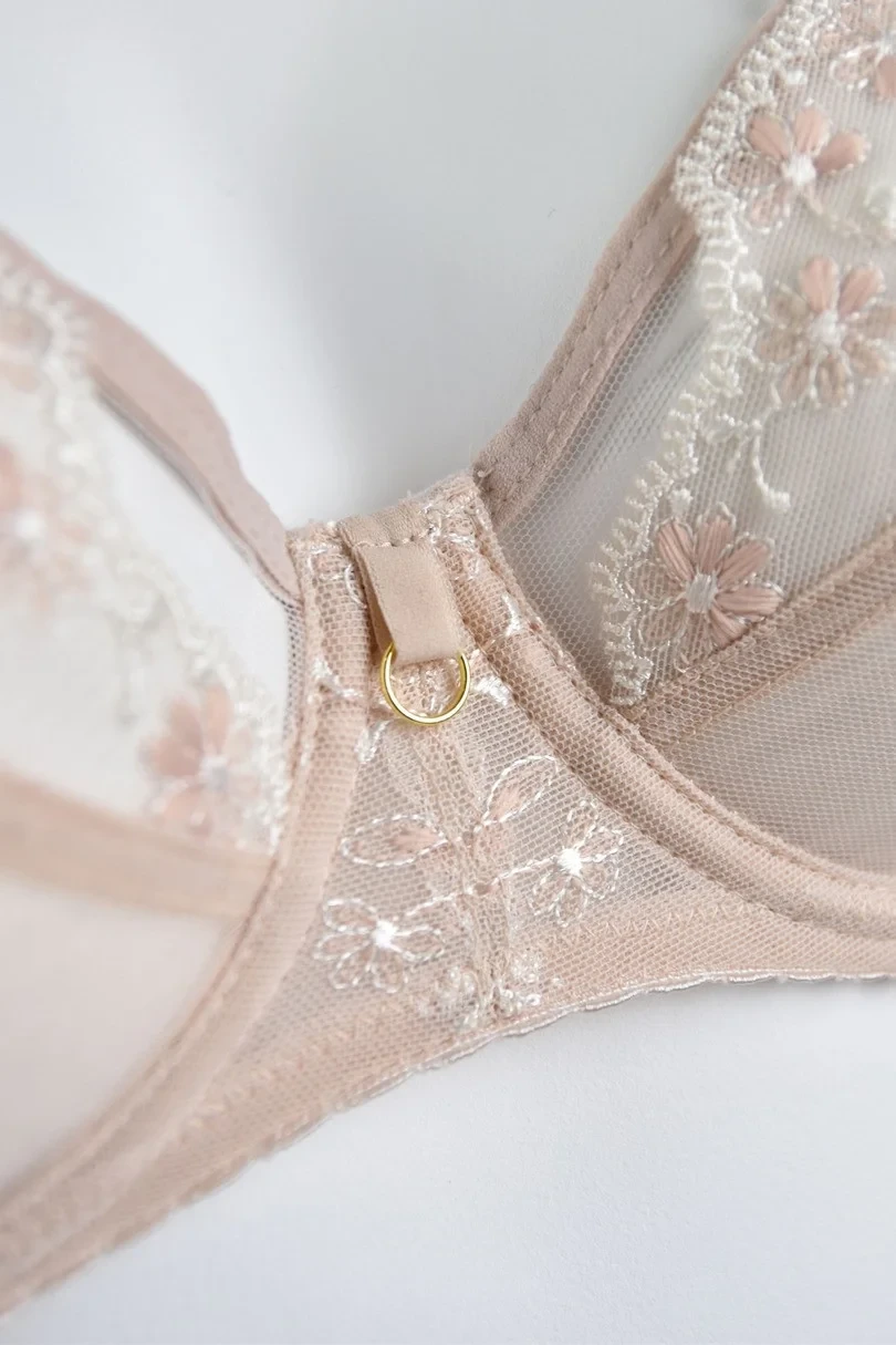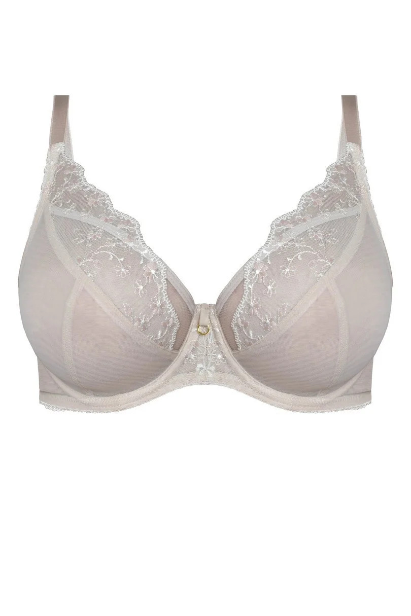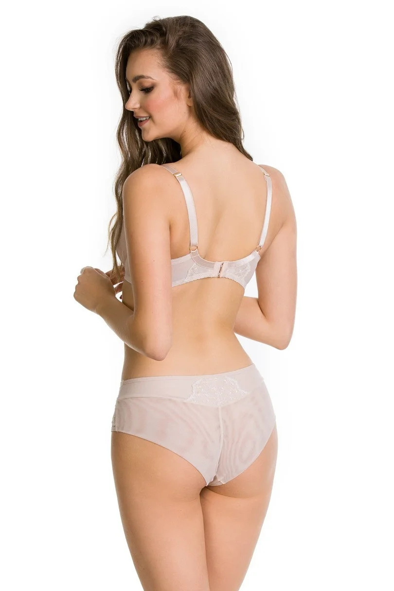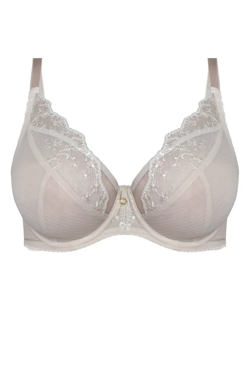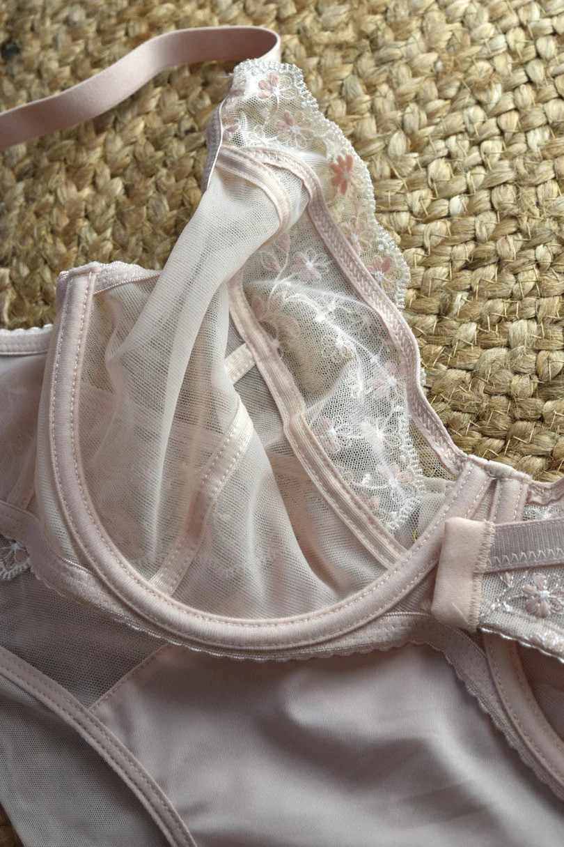 Měkká podprsenka, košíčky z kvalitní strukturální síťoviny, na které je našita krajka s květinovým motivem.