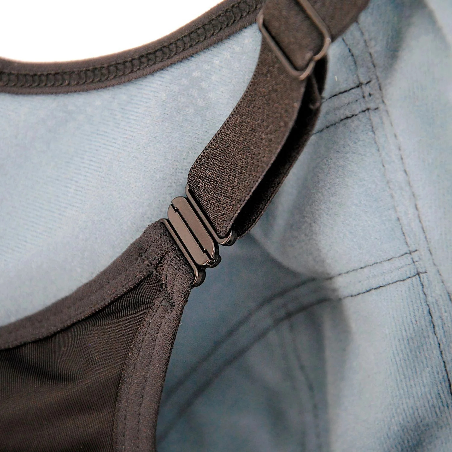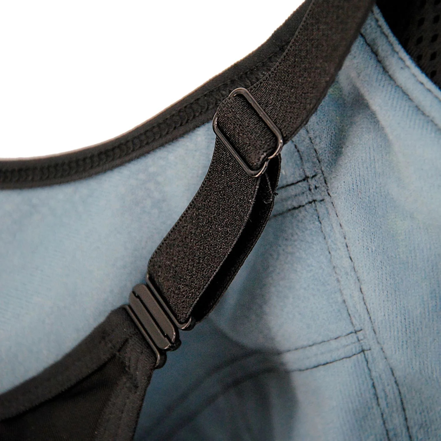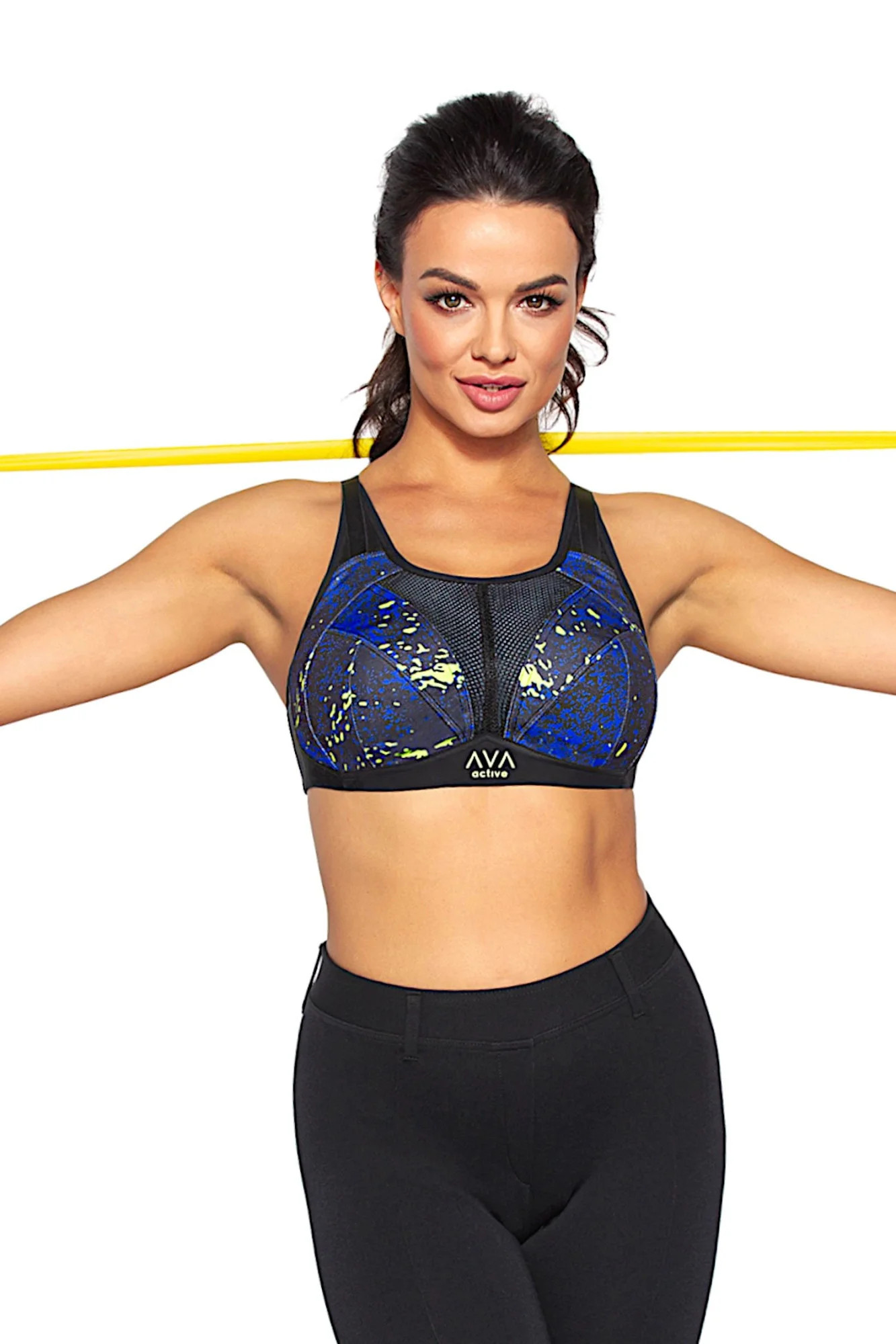 Fitness podprsenka Naomi AVA - světle modrá barva - bez kostic - košíčky z elastického barevného mikrovlákna - podšité látkou, která absorbuje vlhkost - široká ramínka obšitá pěnou - nastavitelná a odepínatelná ramínka - čtyřstupňové zapínání