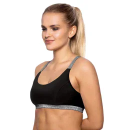 Dámský sportovní top Areta black ELDAR - černá barva - materiál je prodyšný a dobře odvádí pot od těla - nevyztužené košíčky - bez kostic - ramínka jsou na zádech překřížená - širší elastický obvod drží podprsenku bezpečně na místě
