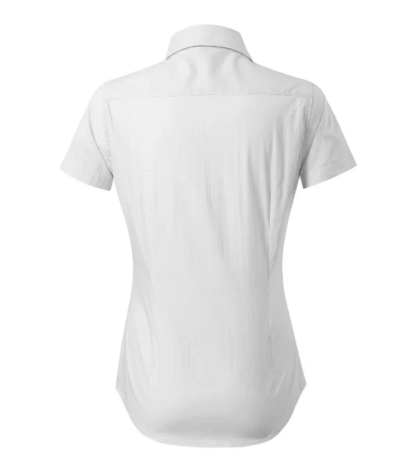 jemný strečový materiál projmutý střih s bočními švy dvojité sedlo na zadním dílu pasové a prsní záševky dvoudílný košilový límec přední kraje začištěny légou perleťové knoflíčky v barvě materiálu (1 náhradní navíc) tvarovaný dolní kraj