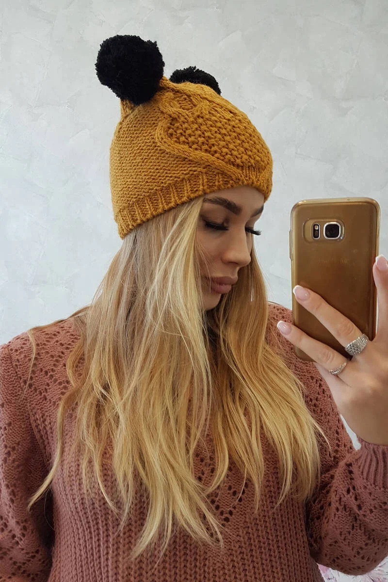 Fleecová čepice 2 bambulky K291 hořčice