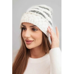 Dámská zimní čepice s příměsí vlny je teplou a stylovou nabídkou na mrazivé dny. Vyrobena z hrubé pleteniny s dekorativním vzorem, přitahuje pozornost nevšedním designem a horizontálními pruhy, které dodávají charakter celé stylizaci. Model se dokonale přizpůsobí hlavě, zajišťující teplo a pohodlí nošení po celý den.