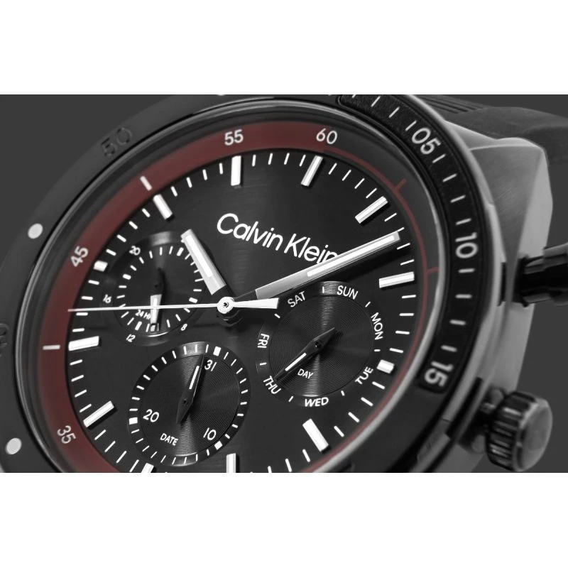 Model CALVIN KLEIN CK Flex to manifest miejskiego stylu z nutą adrenaliny. Kontrast czarnej tarczy i burgundowego pierścienia buduje napięcie wizualne, jakby zegarek miał zaraz wystartować. Na tarczy znajdziesz trzy subtarcze: 24-godzinny tryb, datownik oraz wskaźnik dnia tygodnia – wszystko rozmieszczone tak, by zapewnić intuicyjną czytelność i zachować balans. Solidny bezel i wyraziste przyciski wzmacniają sportowy, a zarazem wyrafinowany klimat zegarka. Gumowy pasek z żłobieniami dopełnia całości, oferując komfort noszenia - sportowy, praktyczny, ale wciąż elegancki. CALVIN KLEIN CK Flex to zegarek, który świetnie odnajdzie się zarówno przy biurku, w trakcie dynamicznych spotkań, jak i wieczorem – podczas spokojnego czasu dla siebie.