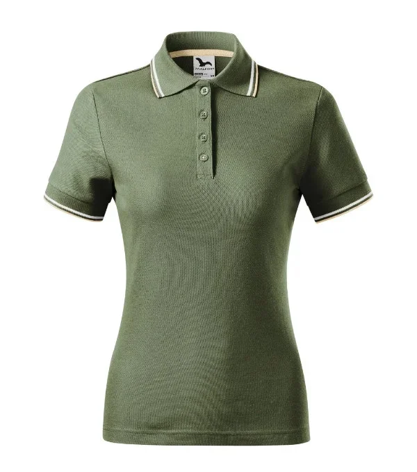lehce vypasovaný střih s bočními švy límeček z žebrového úpletu 1:1 2 kontrastní proužky na rukávu a límečku úzká léga s 4 knoflíčky v barvě materiálu spodní knoflíček přišitý kontrastní nití vnitřní průkrčník začištěn kontrastní páskou zpevnění ramenních švů páskou rozparky v bočních švech s kontrastní páskou zboží II. jakosti, na zboží II. jakosti se nevztahuje reklamace