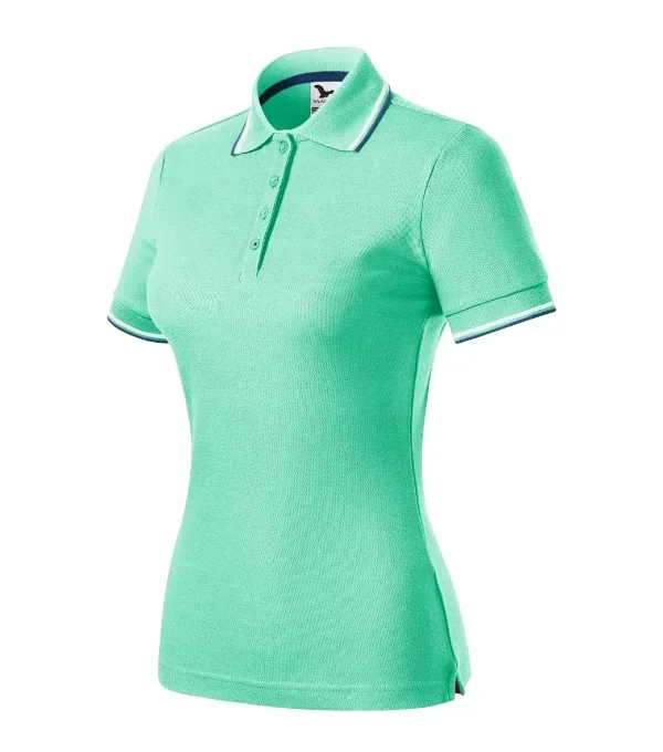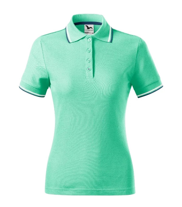 lehce vypasovaný střih s bočními švy límeček z žebrového úpletu 1:1 2 kontrastní proužky na rukávu a límečku úzká léga s 4 knoflíčky v barvě materiálu spodní knoflíček přišitý kontrastní nití vnitřní průkrčník začištěn kontrastní páskou zpevnění ramenních švů páskou rozparky v bočních švech s kontrastní páskou zboží II. jakosti, na zboží II. jakosti se nevztahuje reklamace
