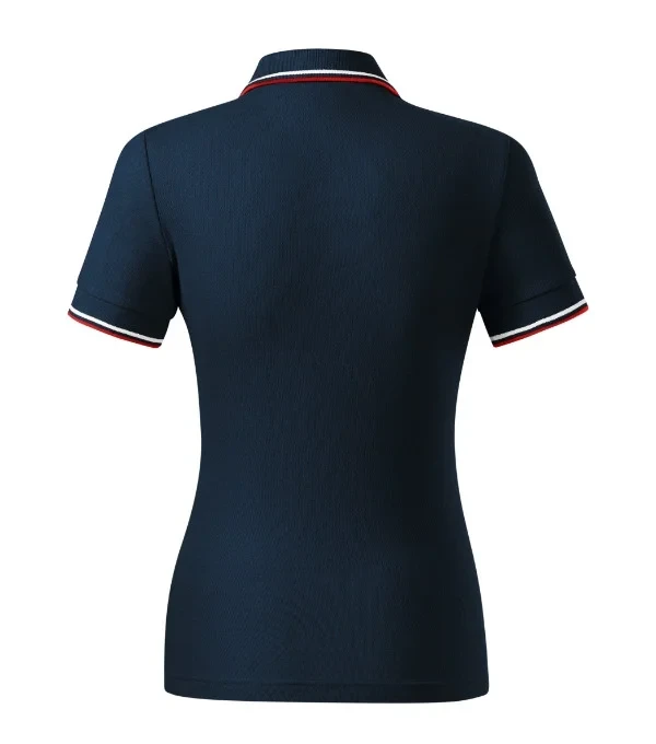 lehce vypasovaný střih s bočními švy límeček z žebrového úpletu 1:1 2 kontrastní proužky na rukávu a límečku úzká léga s 4 knoflíčky v barvě materiálu spodní knoflíček přišitý kontrastní nití vnitřní průkrčník začištěn kontrastní páskou zpevnění ramenních švů páskou rozparky v bočních švech s kontrastní páskou