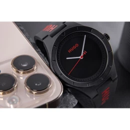 Nosząc Hugo Black pokazujesz, że liczy się nie tylko czas, ale również styl, z jakim go przeżywasz. To nie model, który znika w tle – to zegarek, który głośno podkreśla Twój charakter. Solidny, czarny pasek z dużym logo Hugo w czerwieni nadaje zegarkowi mocnego, miejskiego charakteru, który idealnie łączy sportowy luz z nowoczesnym stylem. Ta odważna kombinacja kolorów – czerni i czerwieni – działa jak magnes na spojrzenia i dodaje Ci pewności w każdej sytuacji.