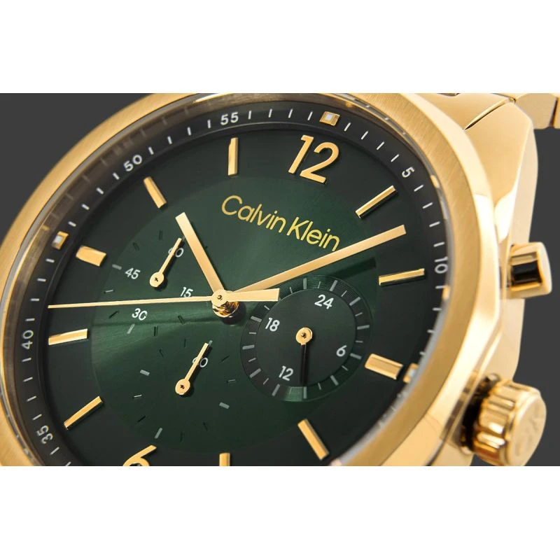 Model CALVIN KLEIN CK Force To projekt, który wybrzmiewa ciszą luksusu. Gładka, szczotkowana stal w odcieniu szampańskiego złota łączy się tu ze szmaragdową tarczą o dynamicznym efekcie sunray, który zmienia się zależnie od światła – niczym dobrze skalibrowany wyświetlacz. Geometryczna forma koperty w połączeniu ze szczotkowaną powierzchnią robi efekt „wow” bez zbędnego błysku. Trzy subtarcze odpowiadają za funkcję 24-godzinnego trybu, datownika oraz dnia tygodnia, zapewniając pełną kontrolę nad czasem. Ich układ został zaprojektowany tak, by zachować czytelność i równowagę wizualną całej tarczy. Całość zamyka solidna koperta z precyzyjnym bezelem, który podkreśla nowoczesny, męski styl. To zegarek, który płynnie przechodzi między biurem, spotkaniem biznesowym a wieczorem przy winie – bez zbędnych kompromisów. Zawsze z klasą, zawsze na poziomie.