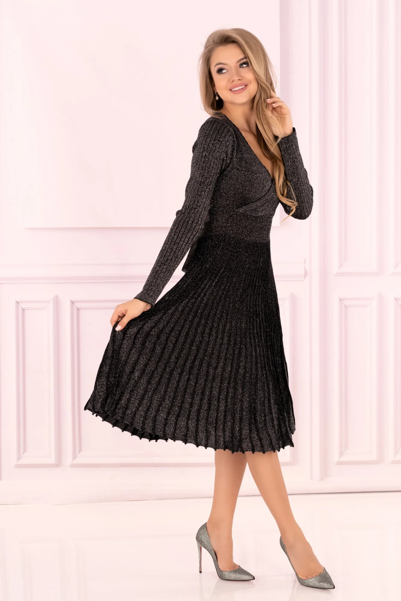 Jedny z nejmódnějších šatů současnosti. Vyrobené z měkkého, pružného úpletu (na bázi bavlny) s krásnou stříbrnou nití vetkanou do látky. Sexy a velmi ženské. Délka ke kolenům, s mírně nařasenou spodní částí a dlouhými rukávy. Svůdný překrytý výstřih. Vrchní část je mírně vypasovaná, spodní část je vzdušná. Šaty mají vzadu zavazování, které vám dává možnost elegantně je přizpůsobit vaší postavě. Složení: 60 % bavlna, 40 % polyester. Modelka je vysoká 172 cm.
