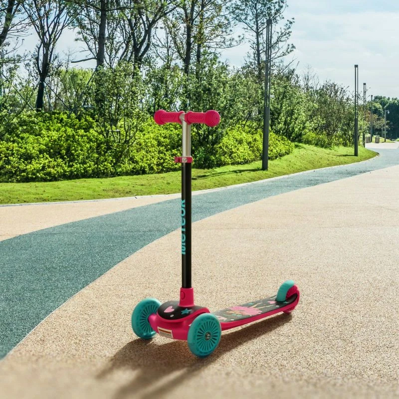 Bezpieczna jazda – trójkołowa konstrukcja z szerokim rozstawieniem przednich kół ułatwia utrzymanie równowagi i naukę jazdy. Hamulec nożny na tylnym kole umożliwia dziecku szybkie i skuteczne zatrzymanie hulajnogi, a świecące koła poprawiają widoczność na drodze, maksymalizując poziom bezpieczeństwa.