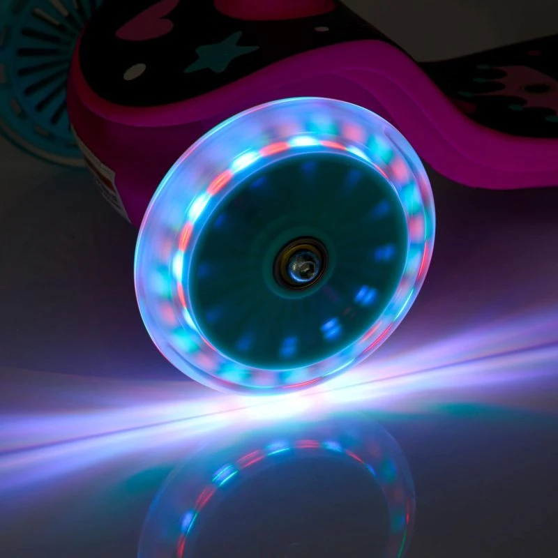 Twarde koła PUC wyposażone w łożyska ABEC-7 zapewniają cichą jazdę, dobrą przyczepność do podłoża oraz trwałość. Wbudowane diody LED poprawiają widoczność na drodze oraz zwiększają bezpieczeństwo. Świecące kółka stanowią również atrakcyjny dodatek, na który zwróci uwagę każde dziecko. Z tyłu hulajnogi znajduje się hamulec nożny, który działa poprzez dociśnięcie go stopą do koła, co zdecydowanie maksymalizuje bezpieczeństwo jazdy. Hamulec pełni również funkcje błotnika, chroniącego przed zachlapaniem.